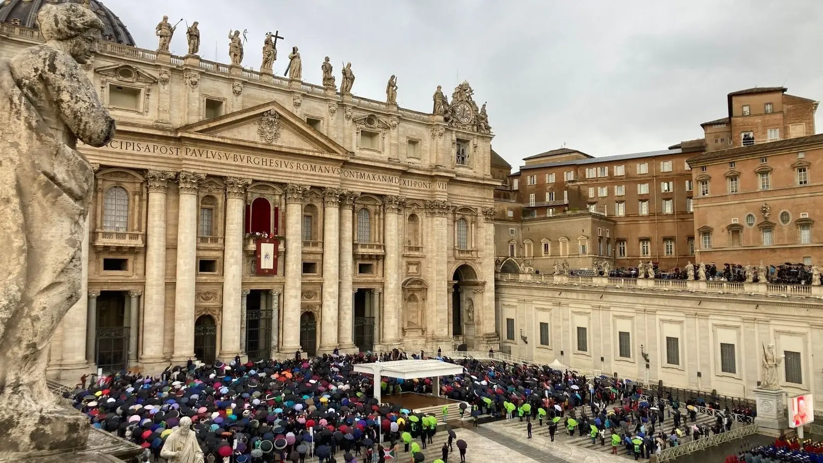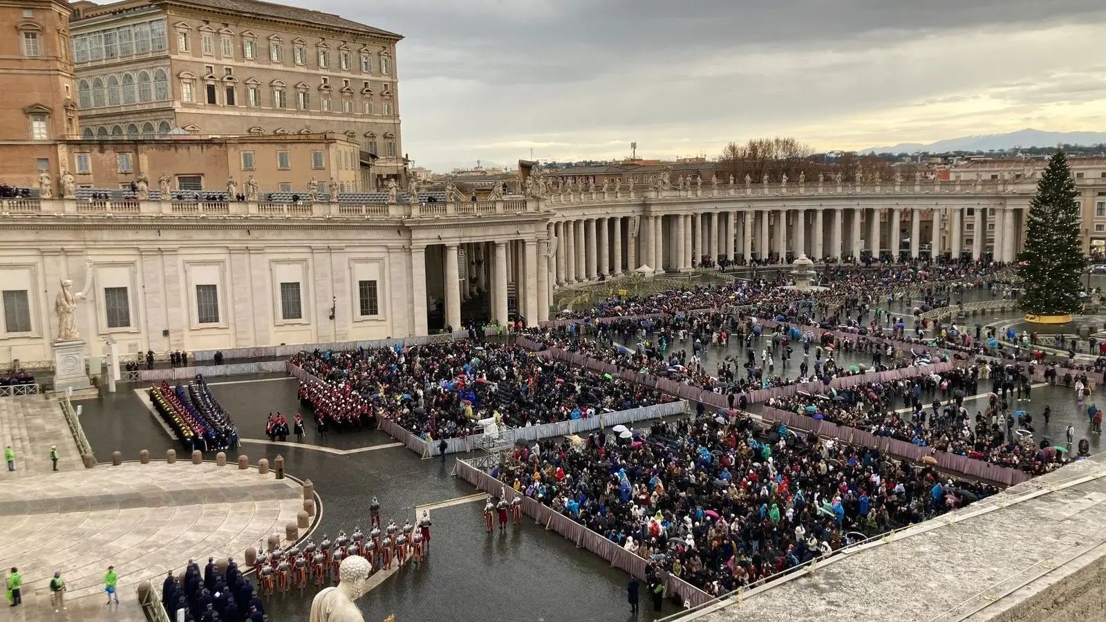 Auf dem Petersplatz verfolgten Tausende die auf Bildschirmen übertragene Messe bei strömendem Regen. Der Papst war eigens vor Beginn der Messe vor den Petersplatz getreten, hatte die unter Regenschirmen wartenden begrüßt, ihnen frohe Weihnachten gewünscht und sich bedankt, dass trotz des schlechten Wetters so viele gekommen seien. Anschließend segnete er sie, bevor er sich vor der Messe noch einmal kurz zurückzog.