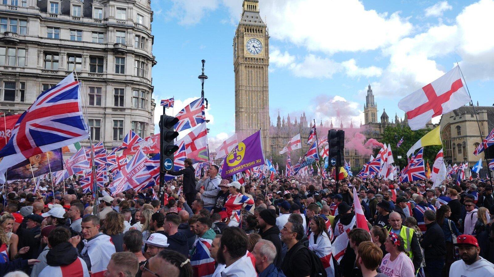 Union Jacks, Flaschenwürfe und Slogans gegen Migration: Eine Demonstration in London zieht Massen von Menschen an.