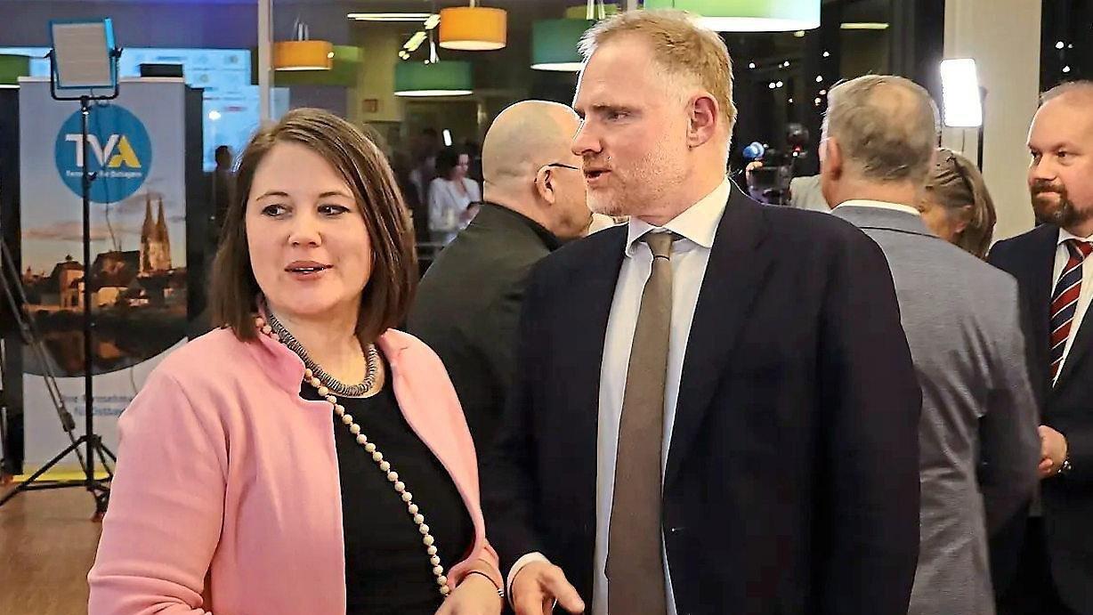 Die Direktkandidaten Carolin Wagner (SPD) und Peter Aumer (CSU) treffen sich auf der Wahlparty in der Regensburger Wahlarena.