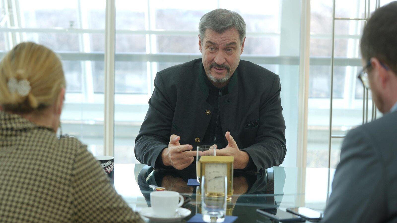 Trotz entsprechender Fernseh- und Videoauftritte: "Eine Zweitkarriere als Sänger ist nicht geplant", beruhigt Ministerpräsident Markus Söder (M.) im Gespräch mit den Redakteuren Markus Peherstorfer und Natalie Kettinger in der Staatskanzlei in München.