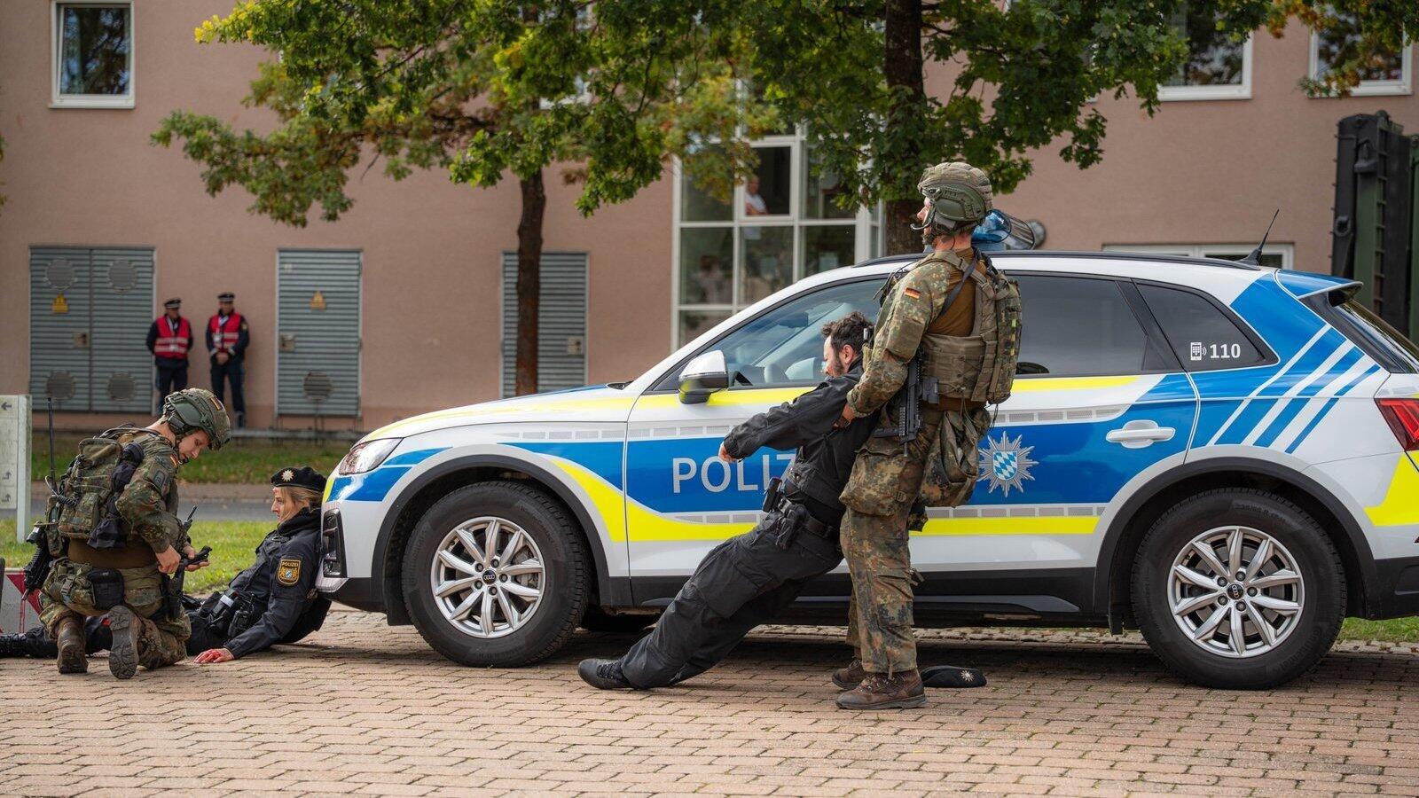Wer übernimmt, wenn Polizeibeamte Opfer eines Anschlags werden? Bei der Übung „RoadTEX“ probten Polizei und Bundeswehr in Sulzbach-Rosenberg den Ernstfall.