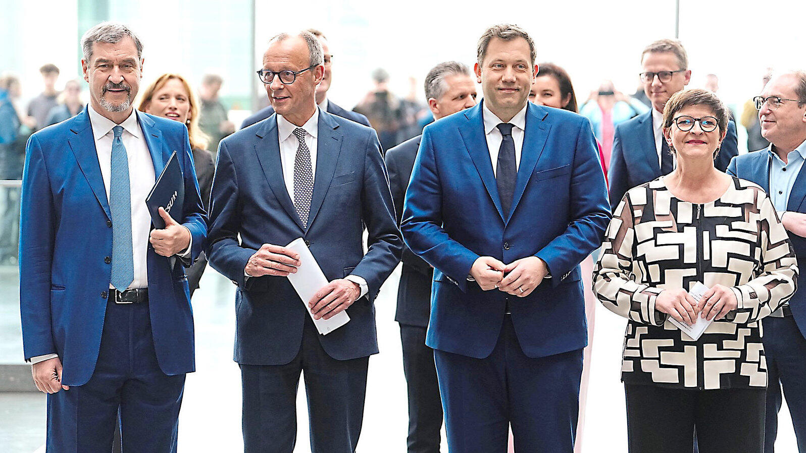 CSU-Chef Markus Söder (v. l.), CDU-Chef und designierter Kanzler Friedrich Merz, die SPD-Vorsitzenden Lars Klingbeil und Saskia Esken versprechen Änderungen bei Migration, Steuern und Bürgergeld.