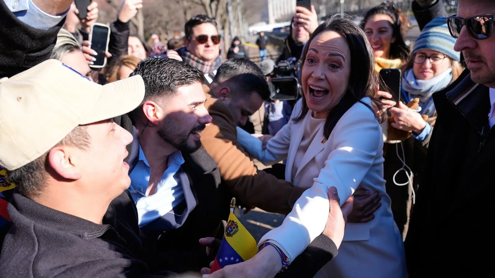 Machado betrat das Gelände des Weißen Hauses zu Fuß durch einen Seiteneingang, wie auf Videos in lateinamerikanischen Medien zu sehen war. Als sie das Weiße Haus verließ, begrüßte sie eine Gruppe von Anhängern, die sich vor dem Regierungssitz versammelt hatten. „Seid versichert, dass wir für die Freiheit Venezuelas auf Präsident Trump zählen können“, sagte sie.
