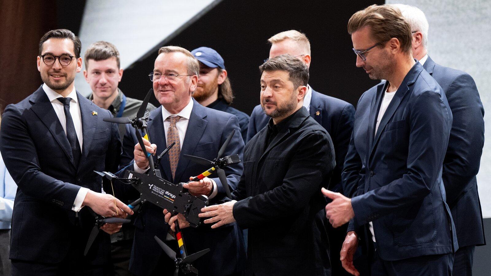 Verteidigungsminister Boris Pistorius (3.v.l.) und der ukrainische Präsident Wolodymyr Selenskyj (5.v.l.) besuchen vor Beginn der Münchner Sicherheitskonferenz den Drohnenhersteller Quantum Frontline Industries. Das deutsch-ukrainische Gemeinschaftsunternehmen soll Drohnen für die Streitkräfte der Ukraine im Krieg gegen Russland produzieren.
