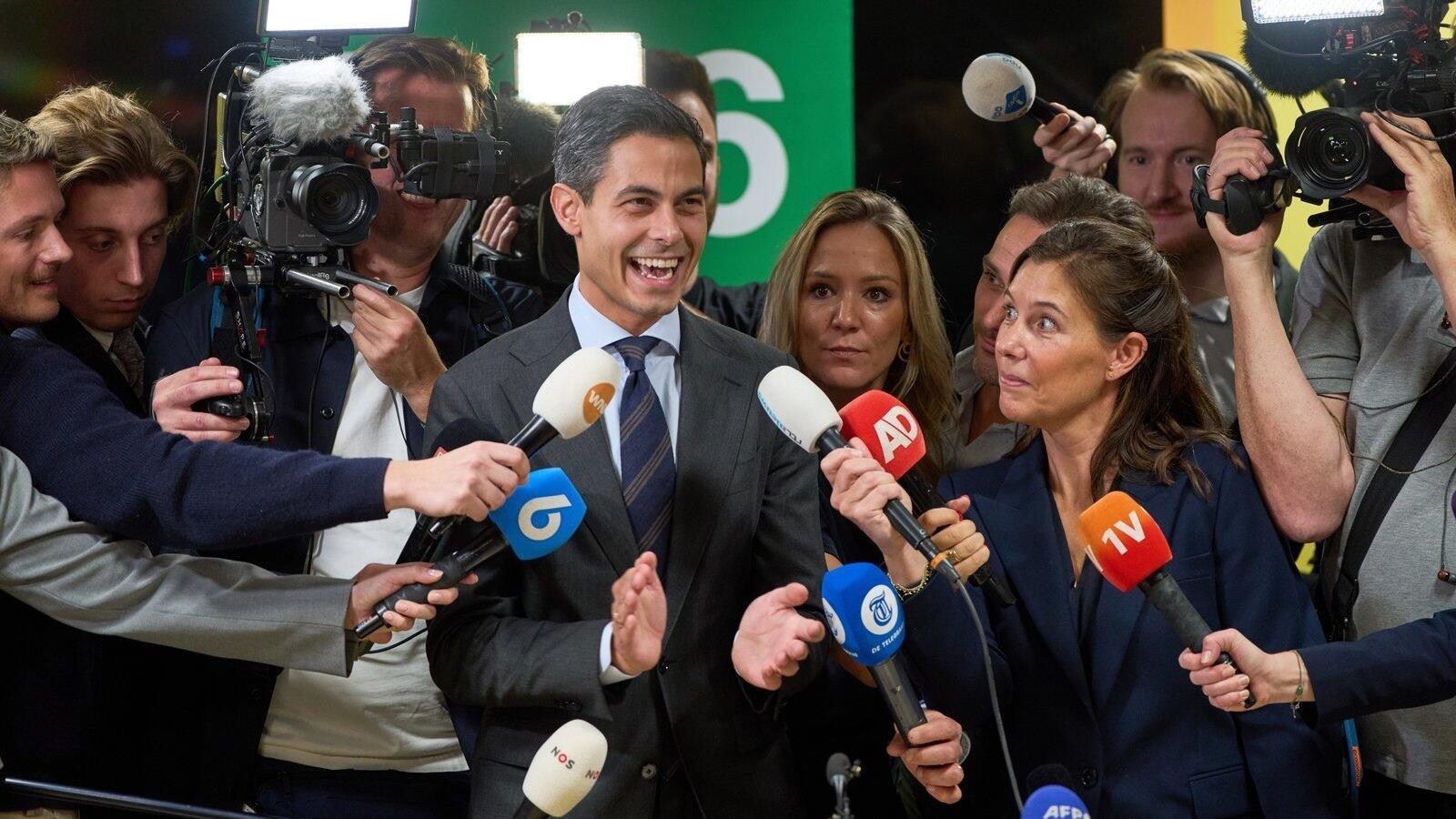 Rob Jetten (M), Vorsitzender der Demokraten 66, D66, feiert einen Tag nach der Parlamentswahl im Repräsentantenhaus. Er hat gute Chancen, der nächste Ministerpräsident der Niederlande zu werden.