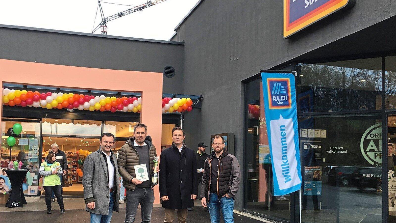 Freuen sich über die Eröffnung der ersten beiden Verbrauchermärkte: von links Bad Kötztings Bürgermeister Markus Hofmann, Investor Matthias Altmann, Stefan Schmidl (Director Real Estate bei Aldi) und dm-Filialleiter Steffen Schreiber.