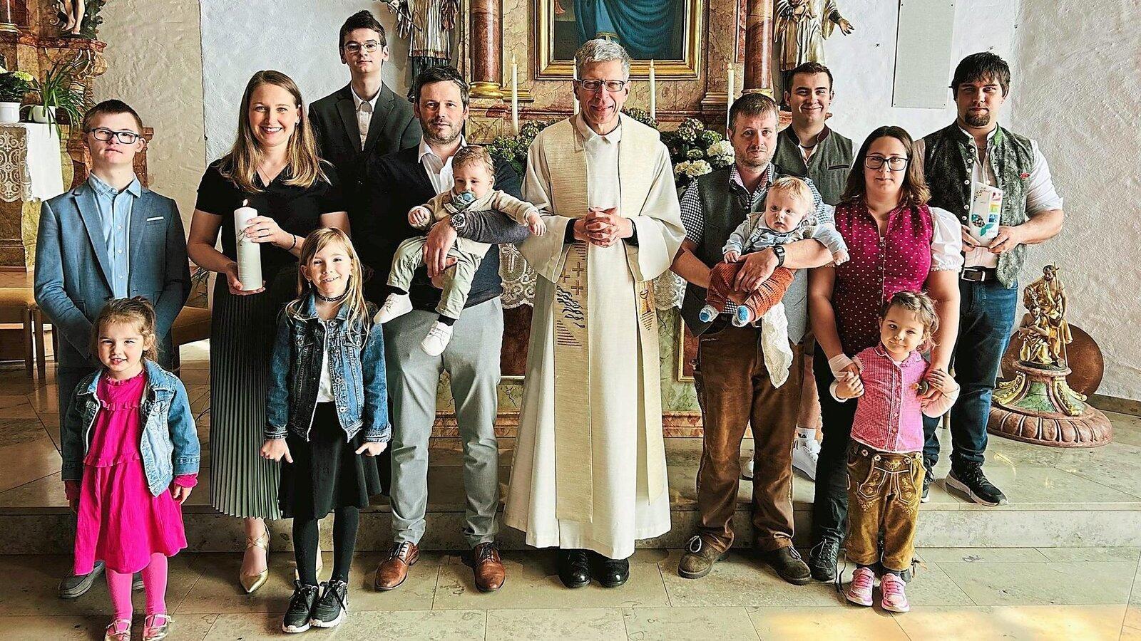 Die Täuflinge Benedikt Schmuderer (links) und Ludwig Eckl mit ihren Eltern und Pfarrer Wutz, den Taufpaten, der kleinen Runa sowie ihren Schwestern Laura und Lisa.