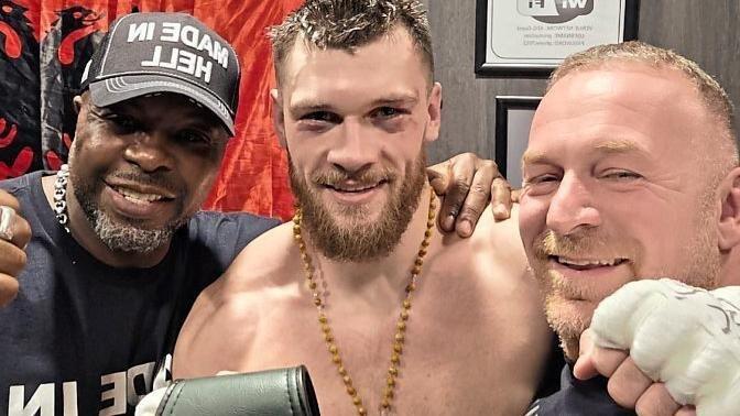Der neue IBO-Weltmeister Jurgen Uldedaj mit seinem Box-Trainer Don Charles (l.) und Athletik-Coach Sepp Maurer (r.)