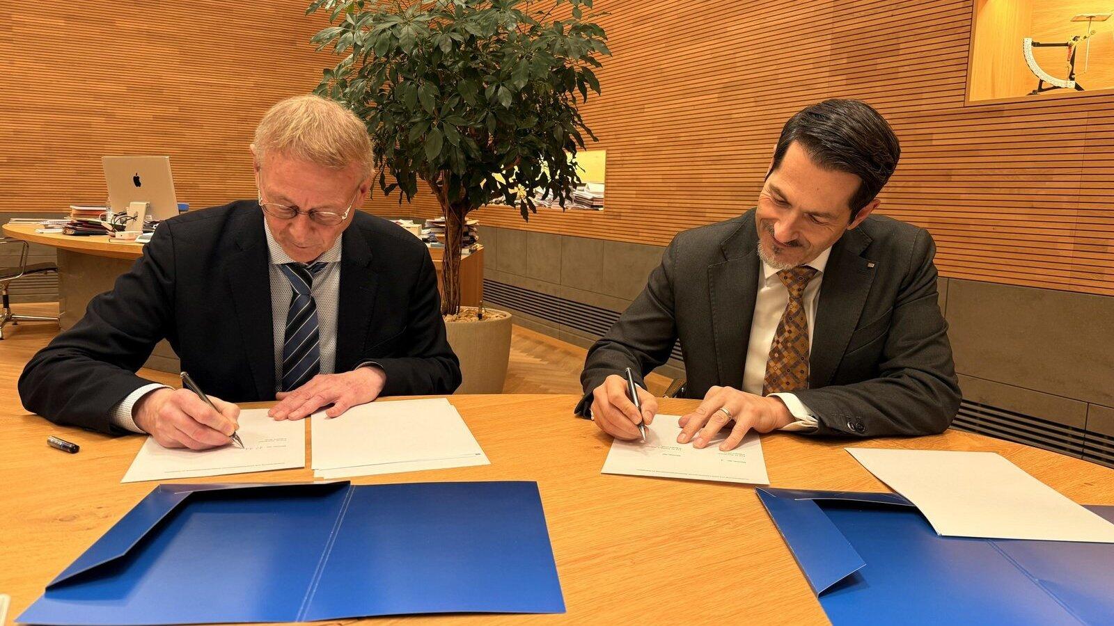 Präsident Prof. Dr. Paul Becker vom Bundesamt für Kartographie und Geodäsie (BKG) und Präsident Prof. Dr. Thomas Hofmann von der TUM unterzeichnen die Campusvereinbarung.