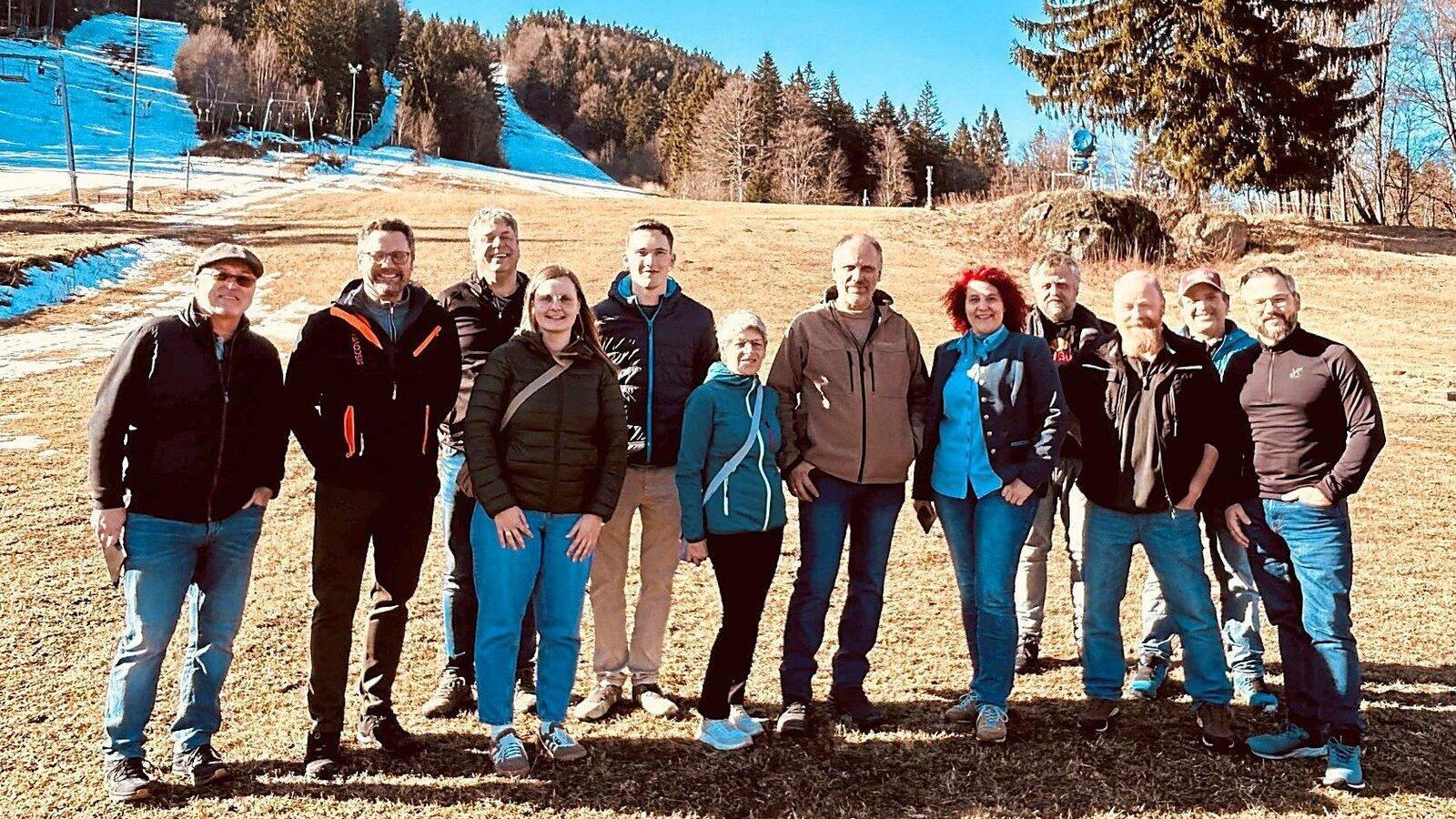 Karl Mühlbauer (6.v.r.) mit Bürgermeisterkandidatin Marion Weber, MdL Dr. Gerhard Hopp (2.v.l.), Hermann Zapf (l.) sowie einem Großteil der Listenkandidaten bei der Talstation des Skigebietes Eck-Riedlstein.