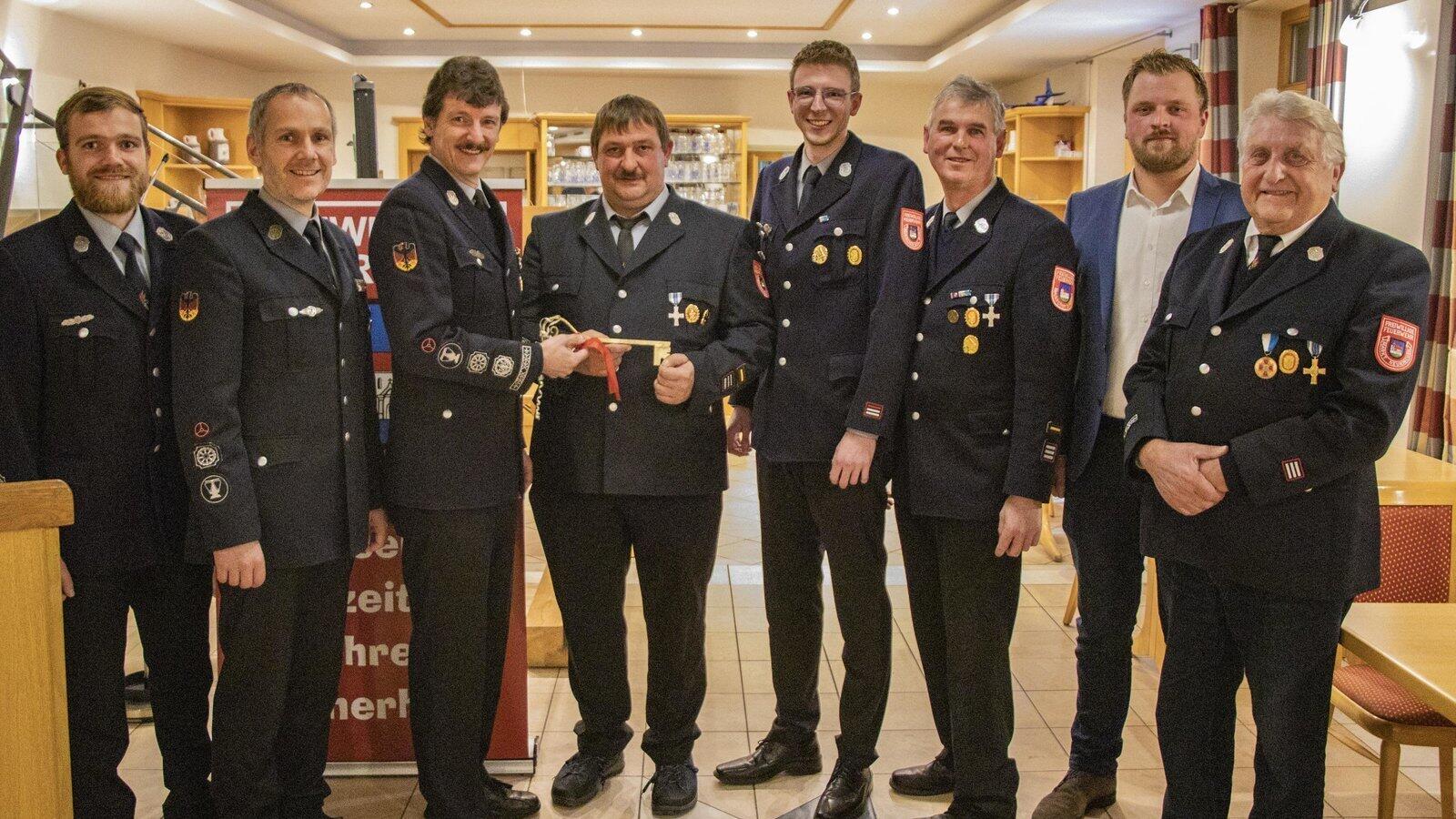 Alois Reimer (Vierter von links) übernimmt den symbolischen Schlüssel aus Händen von Bernhard Bachl (Dritter von links) und damit die Verantwortung für die Mannschaft der Wehr.