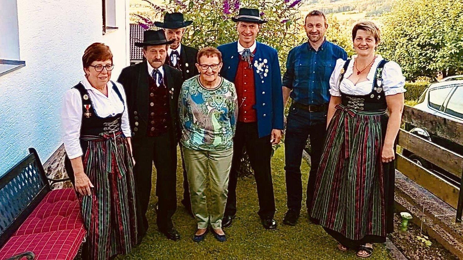 Jubilarin Mathilde Schmidt mit den Gratulanten (v.li.) Roswitha Schmidberger, Xaver Eckl, Thomas Aschenbrenner, Mathilde Schmidt, Thomas Brandl, Gerhard Mühlbauer und Maria Zellner.