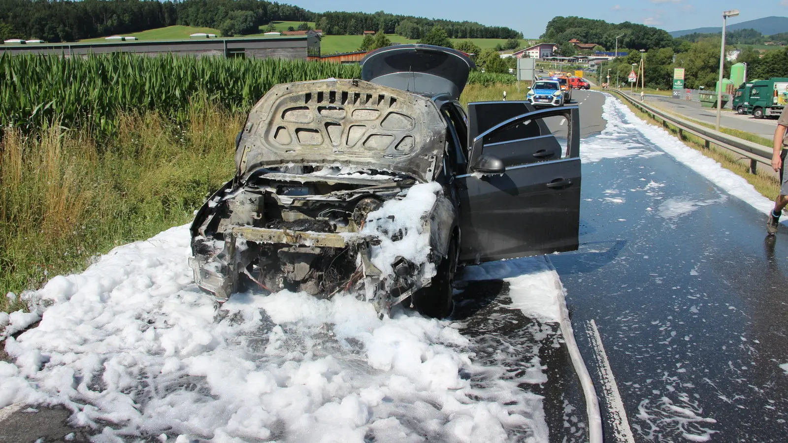 Motorhaube eines brennenden Autos verschmilzt mit Straße bei Eschlkam