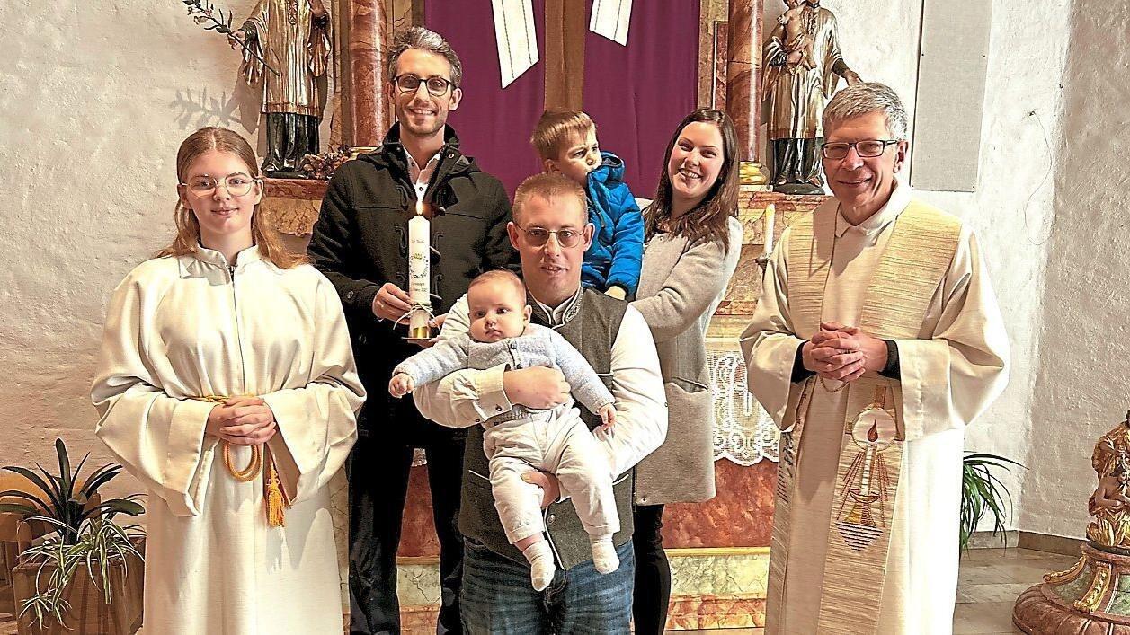 Christoph auf dem Arm seines Paten Daniel Aschenbrenner mit seinen Eltern, Bruder Felix, Ministrantin Romy Haselsteiner und Pfarrer Wutz.