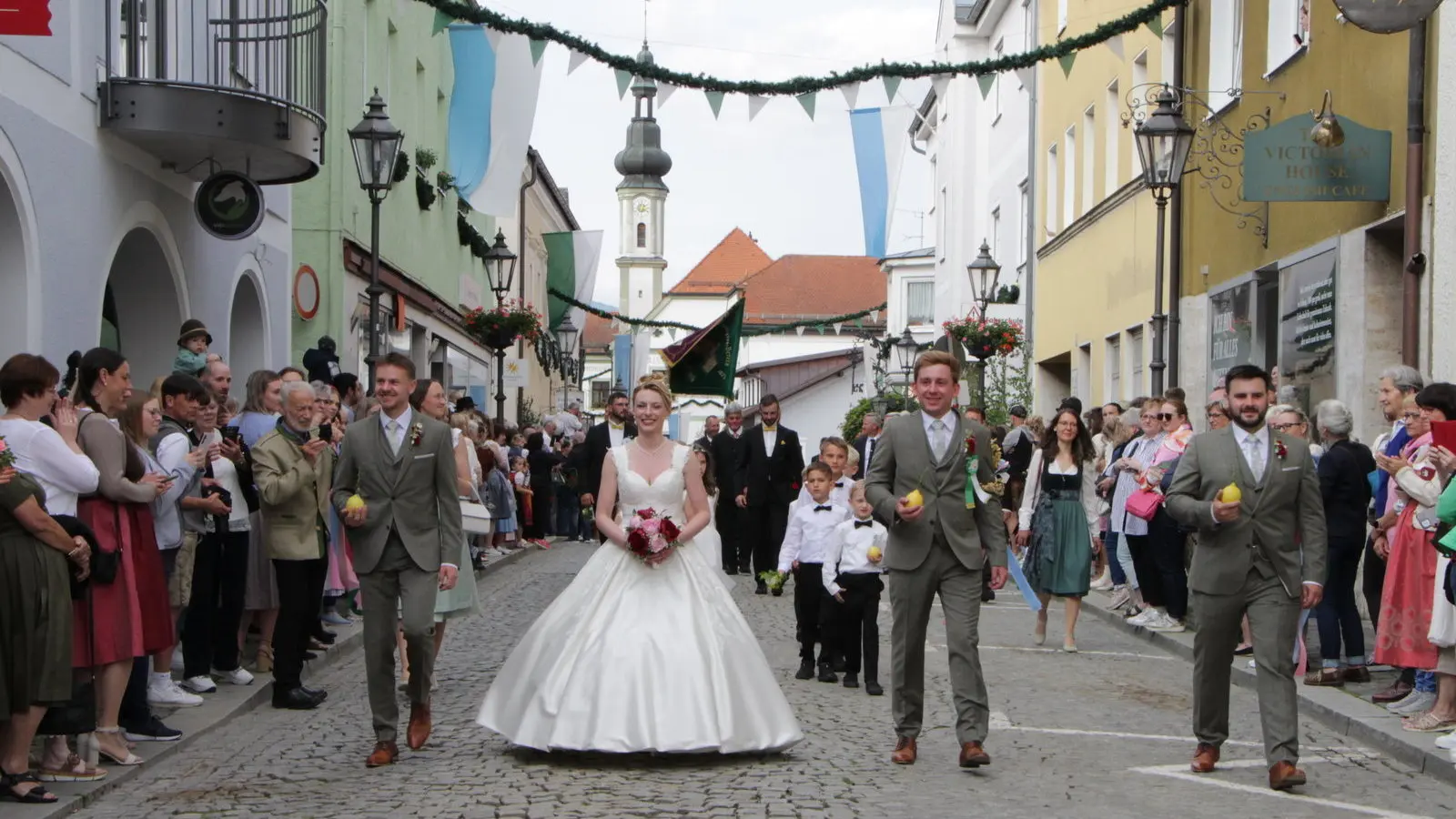 Viele Zuschauer bejubelten das Pfingstbrautpaar Nicklas Neubauer und Anna Maria Pielmeier beim Burschen- und Brautzug am Pfingstmontag in der Innenstadt.