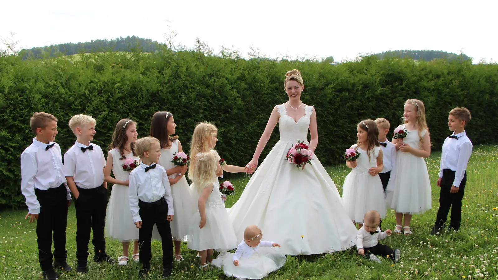 Die Pfingstbraut Anna Maria Pielmeier mit ihren kleinen Begleitern.