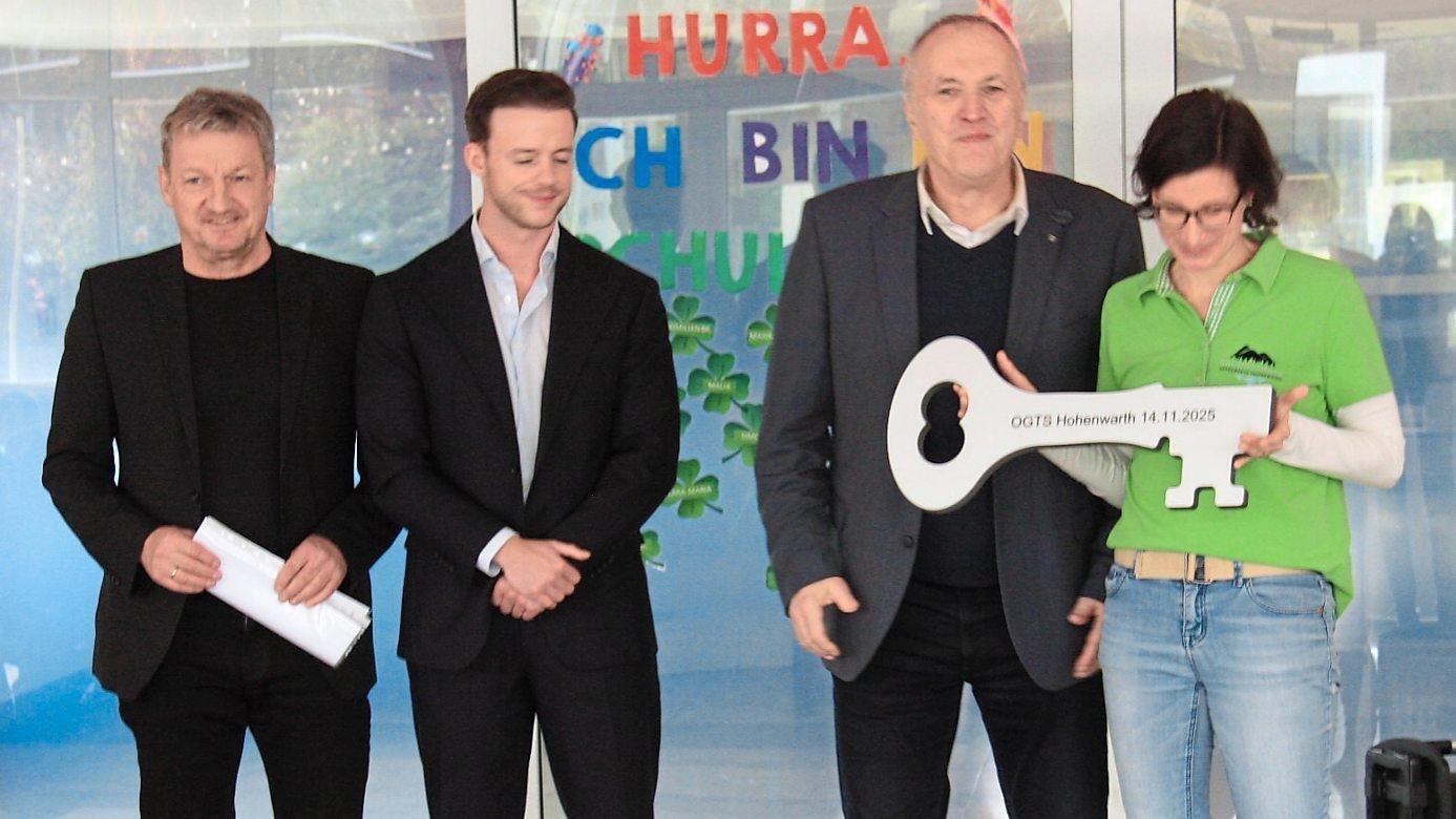 Die Architekten Heitzer übergaben den symbolischen Schlüssel an Bürgermeister Xaver Gmach, der diesen sogleich an Rektorin Königsberger weiterreichte.