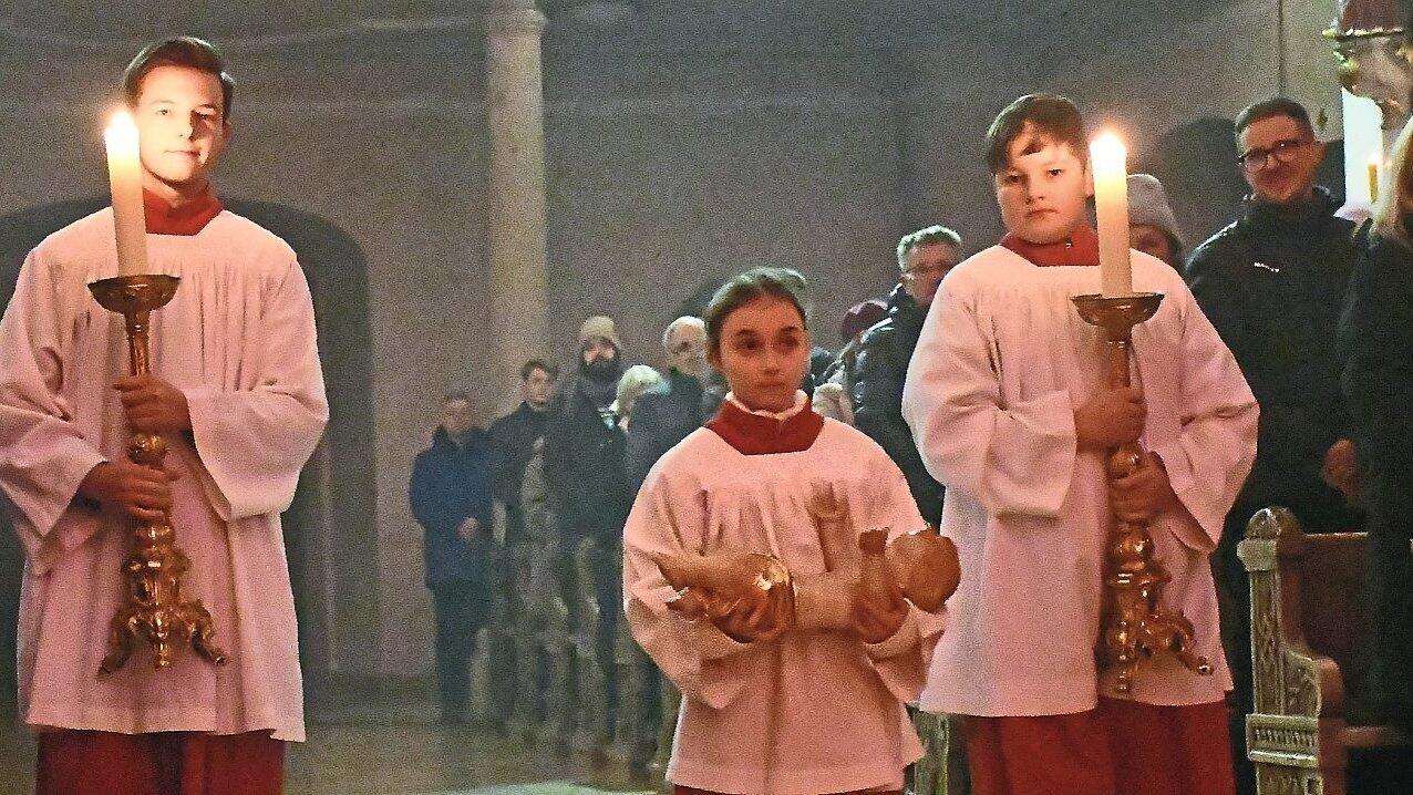 Das Christkind kommt: Ministrantin Lena Sperl bringt das Jesuskind zur Krippe nach vorne.