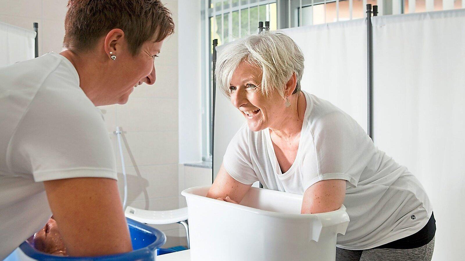 Die beiden Kneippreferentinnen für Kindergesundheit, Heidi Schedlbauer und Gerlinde Behringer, beim Armbad im Sinocur in Bad Kötzting.