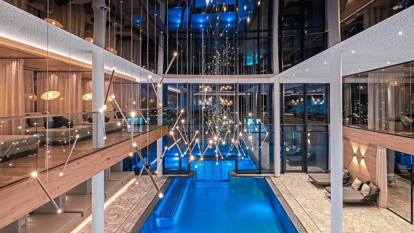 Der mehrstöckige Wellness-Tempel im Hotel Tonihof in Langdorf mit Innen- und Außenbereich, einer Spiegeldecke und Nischen.