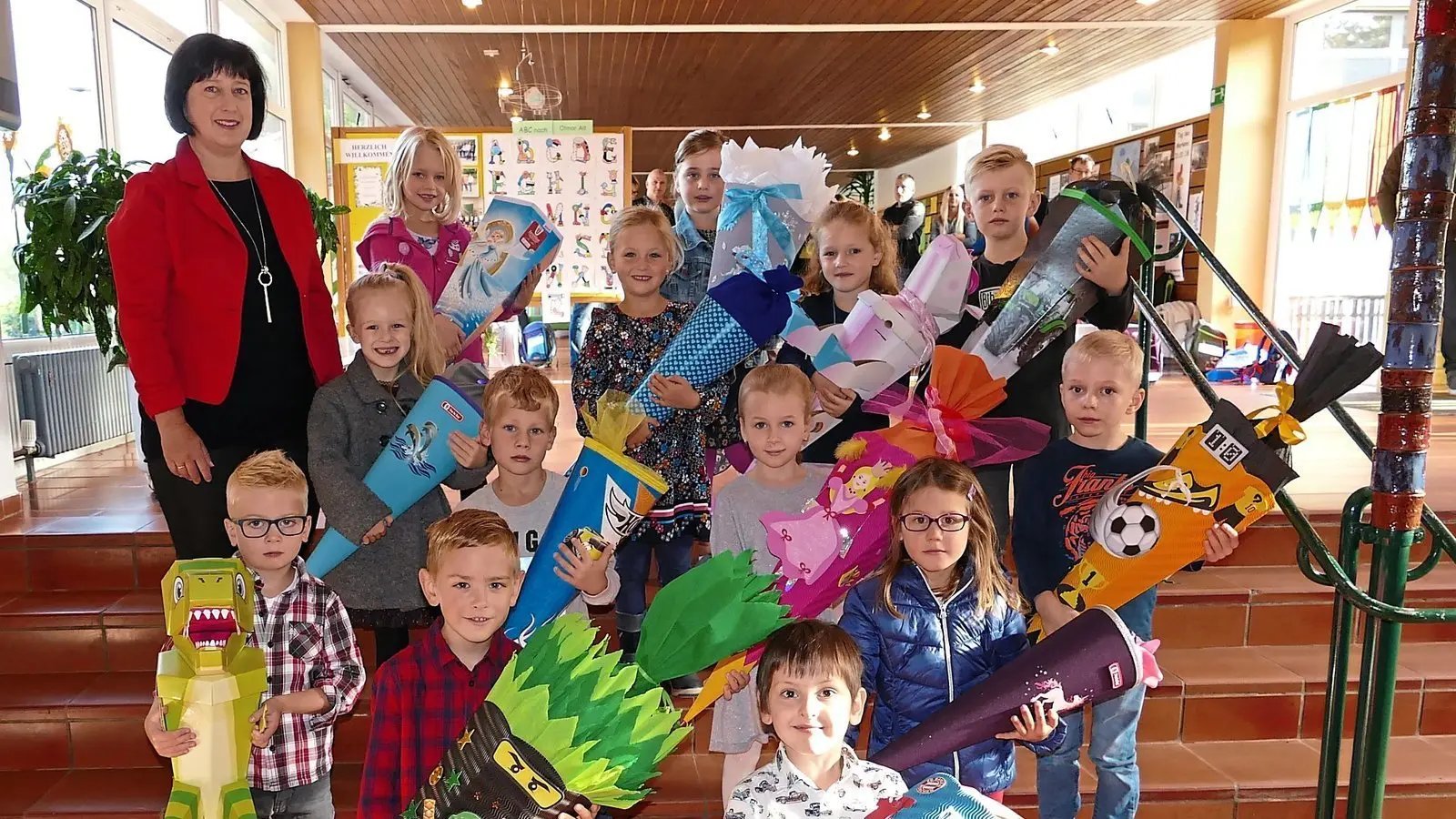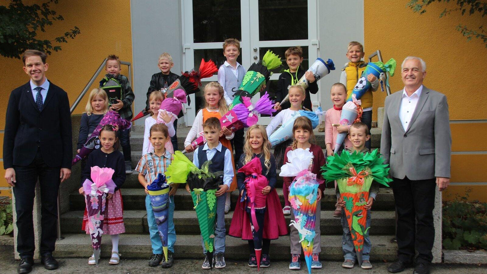 Die 16 Erstklässler der Grundschule Rötz mit Schulleiter Lothar Drachsler (links) und stellvertretendem Bürgermeister Wolfgang Spießl (rechts).