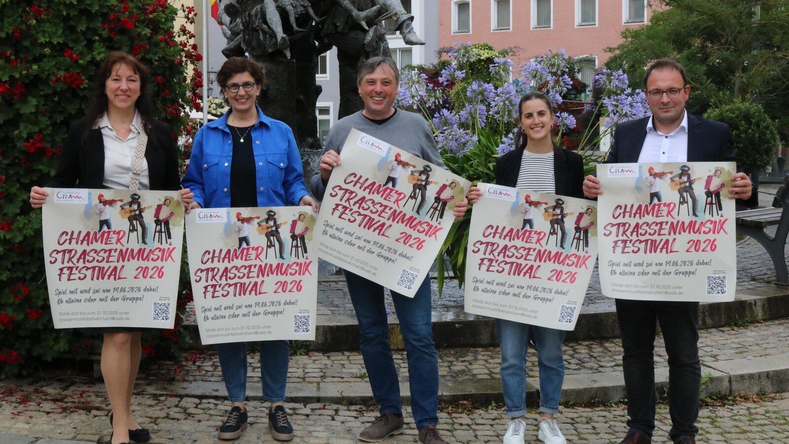 Olivia Schulz vom Stadtmarketing, Kulturreferentin Petra Jakobi, Siegi Mühlbauer, stellvertretender Leiter der Landkreismusikschule, Katrin Pielmeier von der Tourist-Info und Bürgermeister Martin Stoiber (von links) präsentieren die Plakate für das Straßenmusikfestival 2026.