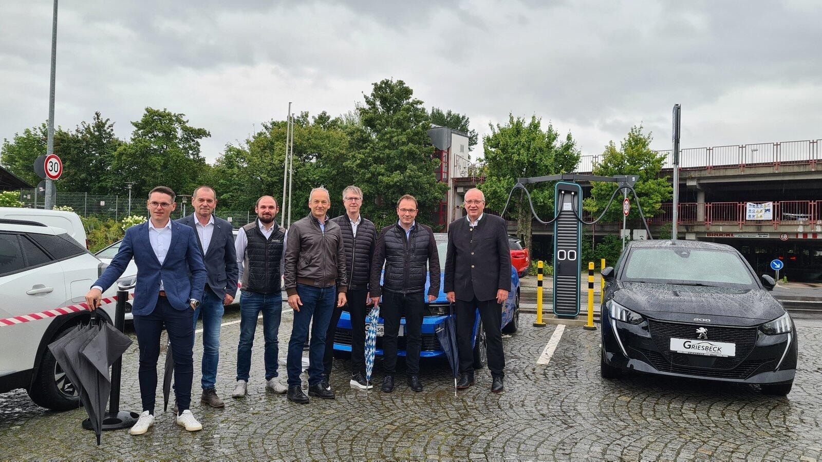 Peter Reif (Mitte), Geschäftsführer des Autohauses Griesbeck in Cham, ist ein Vorreiter für eine grüne Zukunft. Auf dem Gelände seines Autohauses steht seit kurzem eine Schnellladestation für E-Autos. Landrat Franz Löffler, Bürgermeister Martin Stoiber und an dem Bau beteiligte Mitarbeiter des Autohauses sowie des Unternehmens Rädlinger haben am Mittwochvormittag die Ladestation gemeinsam eröffnet.