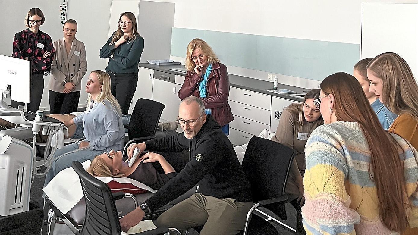 Anderen Berufsgruppen über die Schultern blicken und dabei für den eigenen Beruf lernen: Dr. Hans-Jürgen Hackl gibt einen Einführungskurs in die Sonografie.