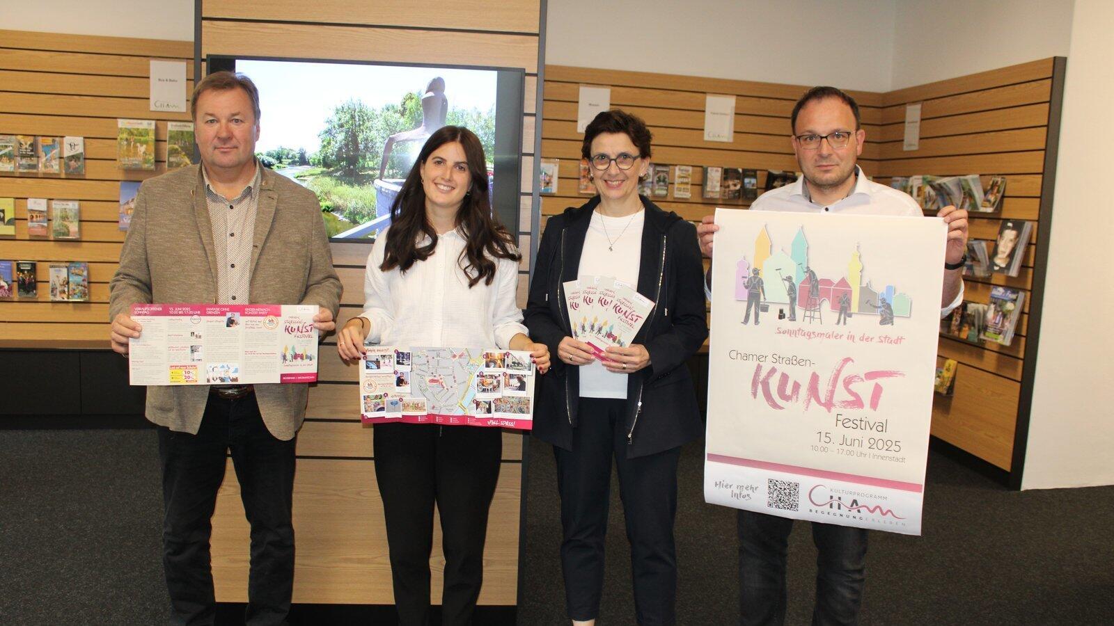 Bürgermeister Martin Stoiber, die beiden Organisatorinnen Petra Jakobi und Katrin Pielmeier sowie zweiter Bürgermeister Walter Dendorfer (von rechts) freuen sich schon auf das Straßenkunstfestival am 15. Juni.