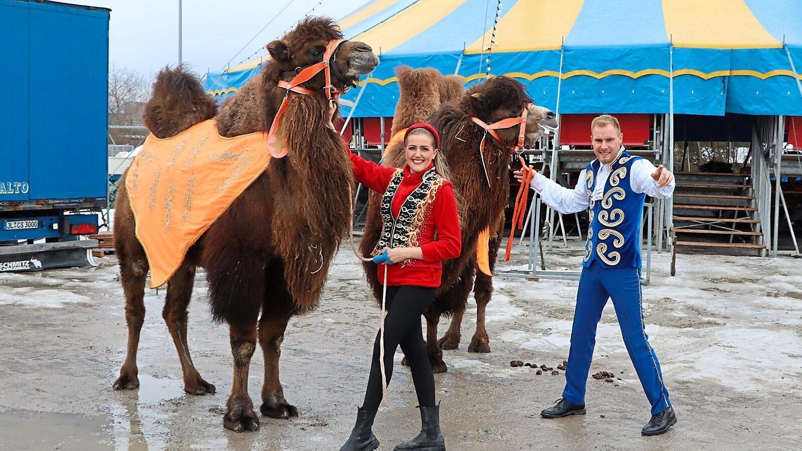 Alle paar Wochen schlägt der Zirkus Salto sein Zelt woanders auf. Leanik Zobel (links) und ihr Mann Tayron Köllner reisen im Wohnwagen mit, ihr Zuhause ist der Zirkus. Immer mit dabei: Kamele, Zebras, Pferde, Papageien und Co. - insgesamt mehr als 50 Zirkustiere.