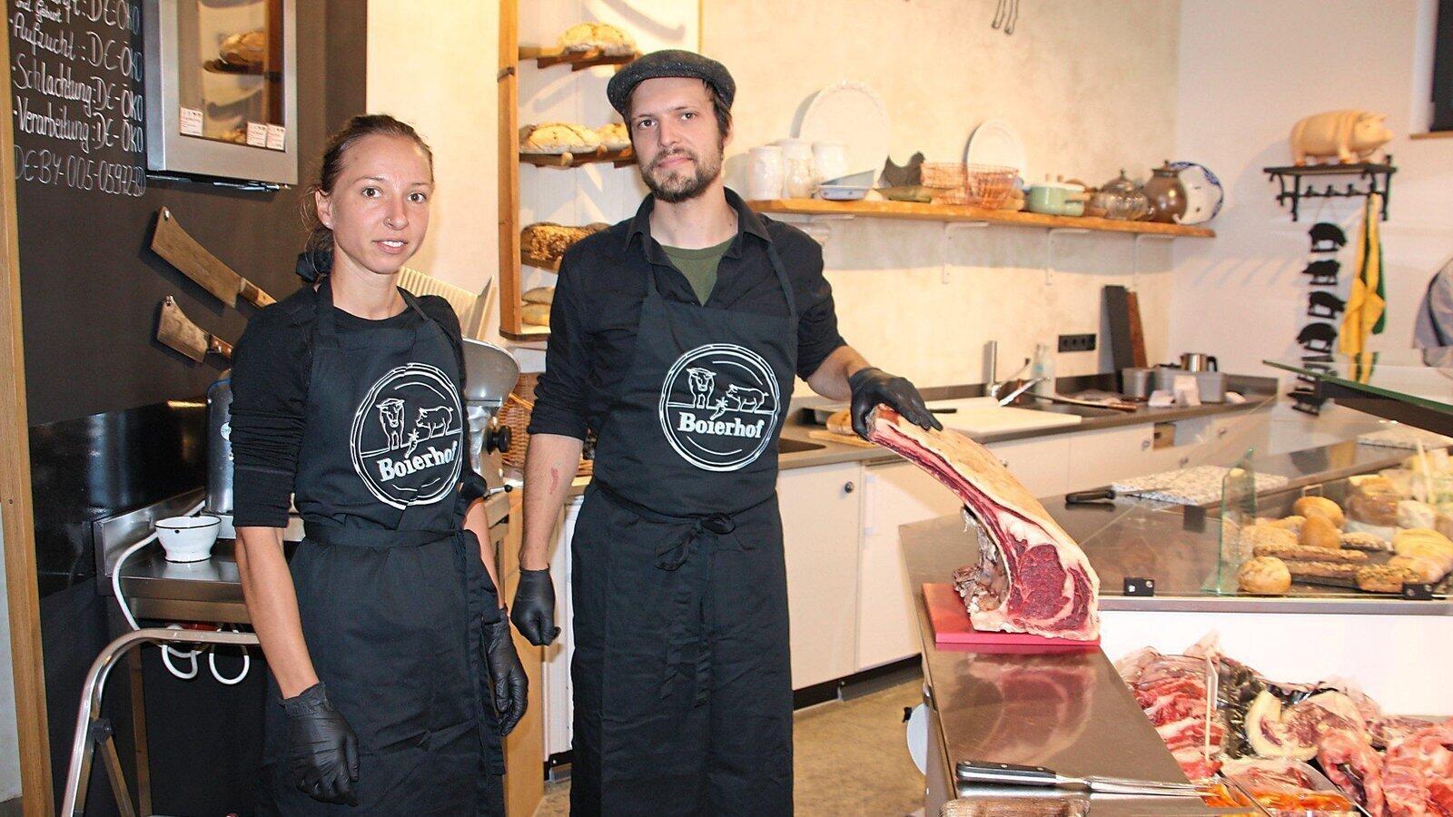 Julia Hausladen und ihr Schwager Lorenz Hausladen wissen genau, wie die Tiere gelebt haben, deren Fleisch in der Theke des Hofladens am Boierhof landet.