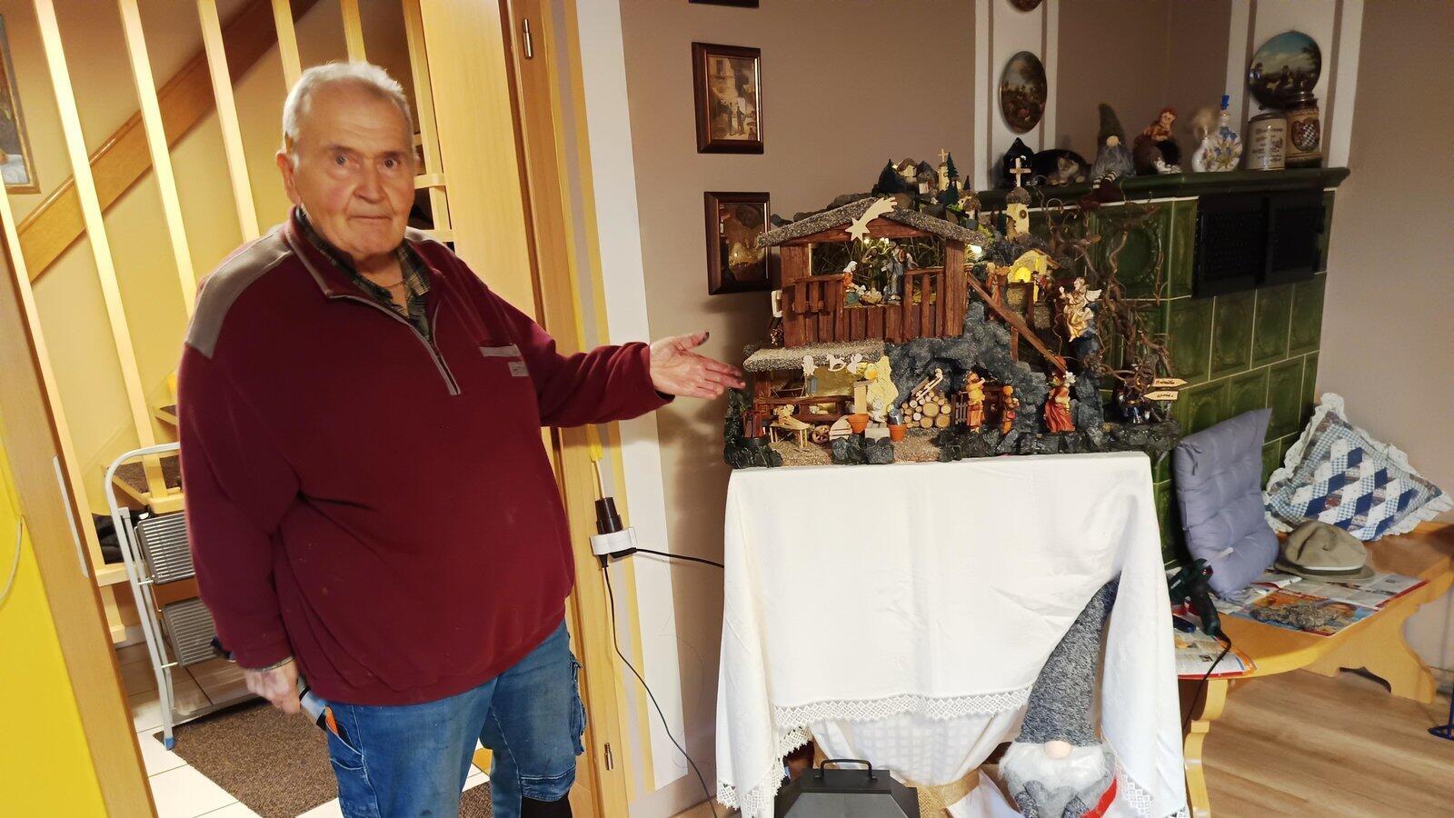 Franz Feil präsentiert seine mehrstöckige Krippe, die er in vielen Tüftel- und Arbeitsstunden gebastelt hat.
