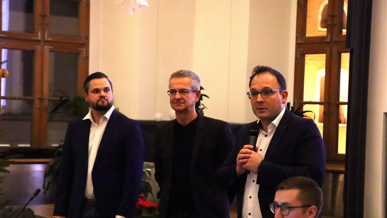 Bürgermeister Martin Stoiber, Konzernbevollmächtigter bei der Deutschen Telekom Stefan Kranz und Kommunalberater Glasfaser von der Deutschen Telekom Christian Beiderbeck (von rechts) informieren über den Glasfaserausbau „Graue Flecken“ ab dem kommenden Jahr.