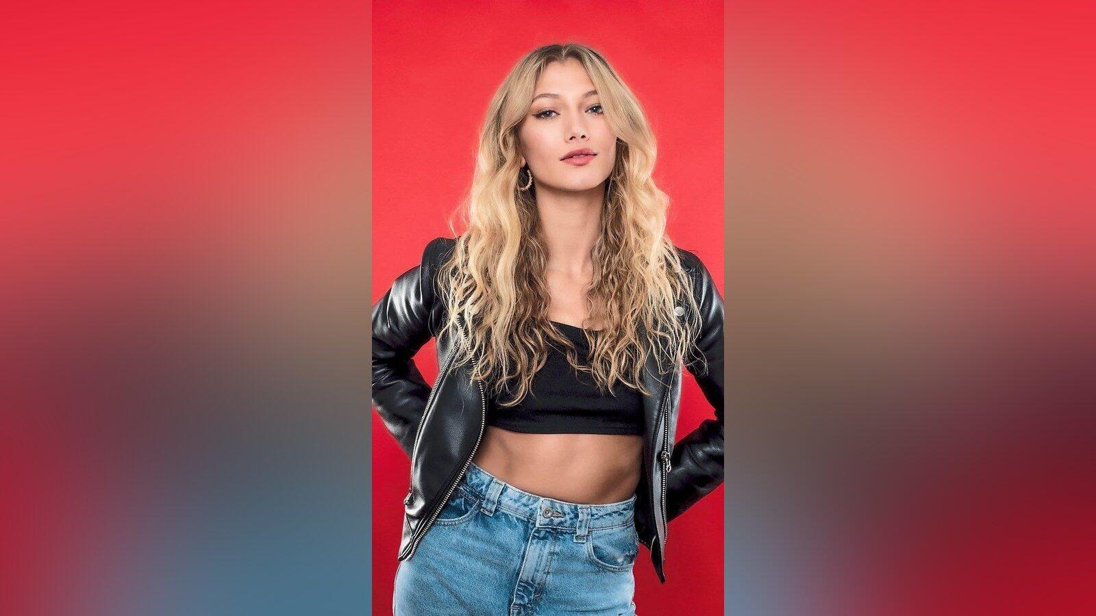 Lächelnd, das Kinn lässig auf die Hand gestützt, sitzt Leonie Burger vor einer Wand mit Auszeichnungen. Unter den Goldenen Schallplatten ist auch eine für ihren Song "Never let me down" zusammen mit dem Musikprojekt