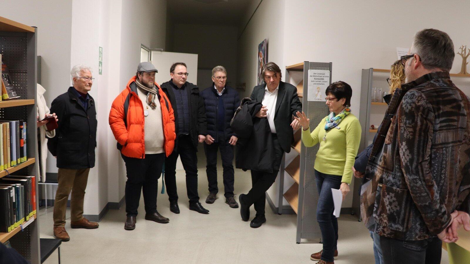 Die Chamer Bibliotheksleiterin Evelyn Fellner führt einige Stadträte und Bürgermeister Martin Stoiber durch ihr Reich aus Regalreihen.