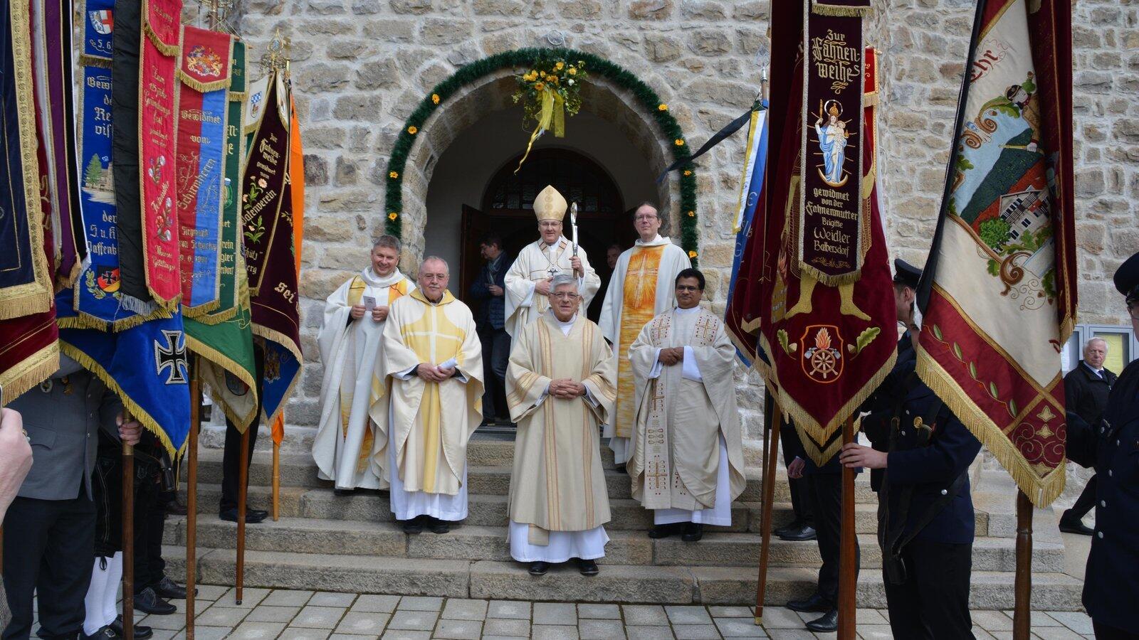 Bischof Rudolf Voderholzer mit Pfarrer Michael Reißer sowie Pfarrer Gregor Zyznowski, Pfarrer Josef Spitzhirn, Diakon Konrad Müller, Pater Joseph Kizhakepurathu (vordere Reihe von links) inmitten der Fahnenabordnungen der Vereine