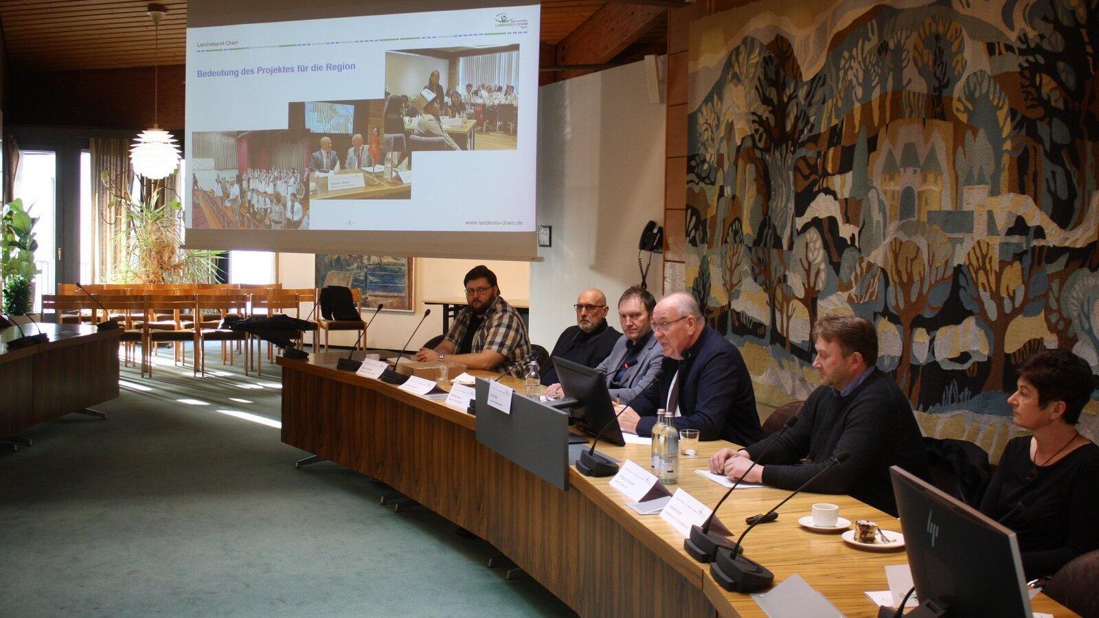 Isabella Bauer von der Wirtschaftsförderung des Landkreises, Wolfgang Kürzinger, Leiter des Arbeitsagenturbereichs Cham, Landrat Franz Löffler, Bernhard Lang, Geschäftsführer der Arbeitsagentur Schwandorf, VHS-Geschäftsführer Winfried Ellwanger und sein Mitarbeiter Yevhenii Kozmenko (von rechts).