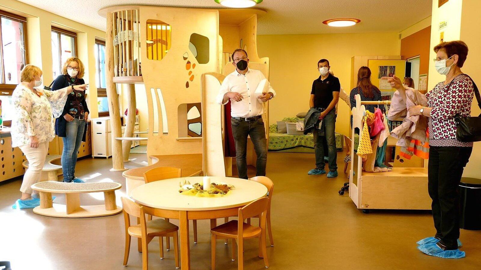 Das Siegeszeichen des Mädchens war angebracht: Die Kinder sind die Gewinner der Sanierungsmaßnahmen am Haderstadler Kindergarten. Und eine Kiste Spieltiere gab's auch noch.