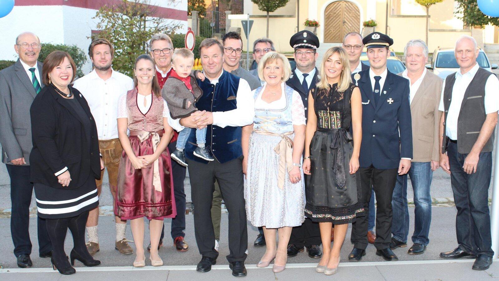 Jubilar Walter Dendorfer mit Enkel Lukas am Arm, seiner Familie, Vizebürgermeisterin Christa Strohmeier-Heller (Zweite von links), Polizeichef Alfons Windmaißer (rechts) und den Vertretern der Vereine.