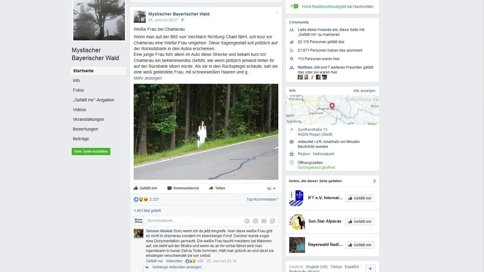 Ein Post der Facebook-Seite "Mystischer Bayerischer Wald" ging in den vergangenen Tagen durch halb Facebook: Der Post mit der Geschichte von der "Weißen Frau bei Chamerau" wurde fast 1.500 Mal geteilt und über 5.000 Mal kommentiert (Stand 28. Juni).