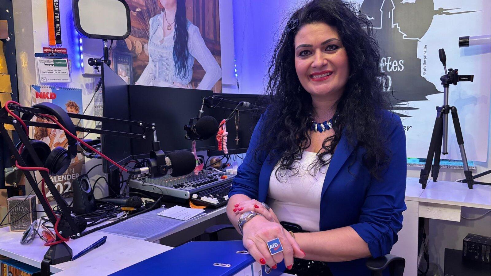 Christl Fischer sitzt in ihrem Studio, in dem sie ihre Radiosendung moderiert. Ihr großer Ring und die Sakkofarben verraten die Partei: Fischer ist die AfD-Landratskandidatin.