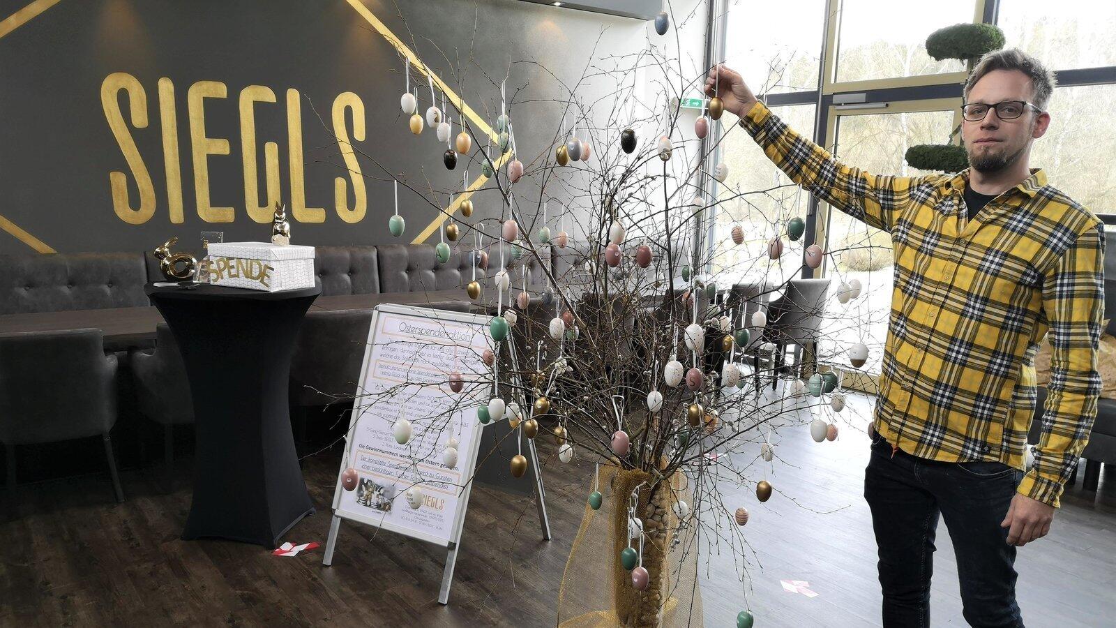 Für eine Spende von mindestens fünf Euro kann man sich vom geschmückten "Baum" im Restaurant ein Ei mitnehmen. Damit nimmt man an der Verlosung teil, und der Betrag, der so zusammenkommt, wird einer bedürftigen Further Familie gespendet.