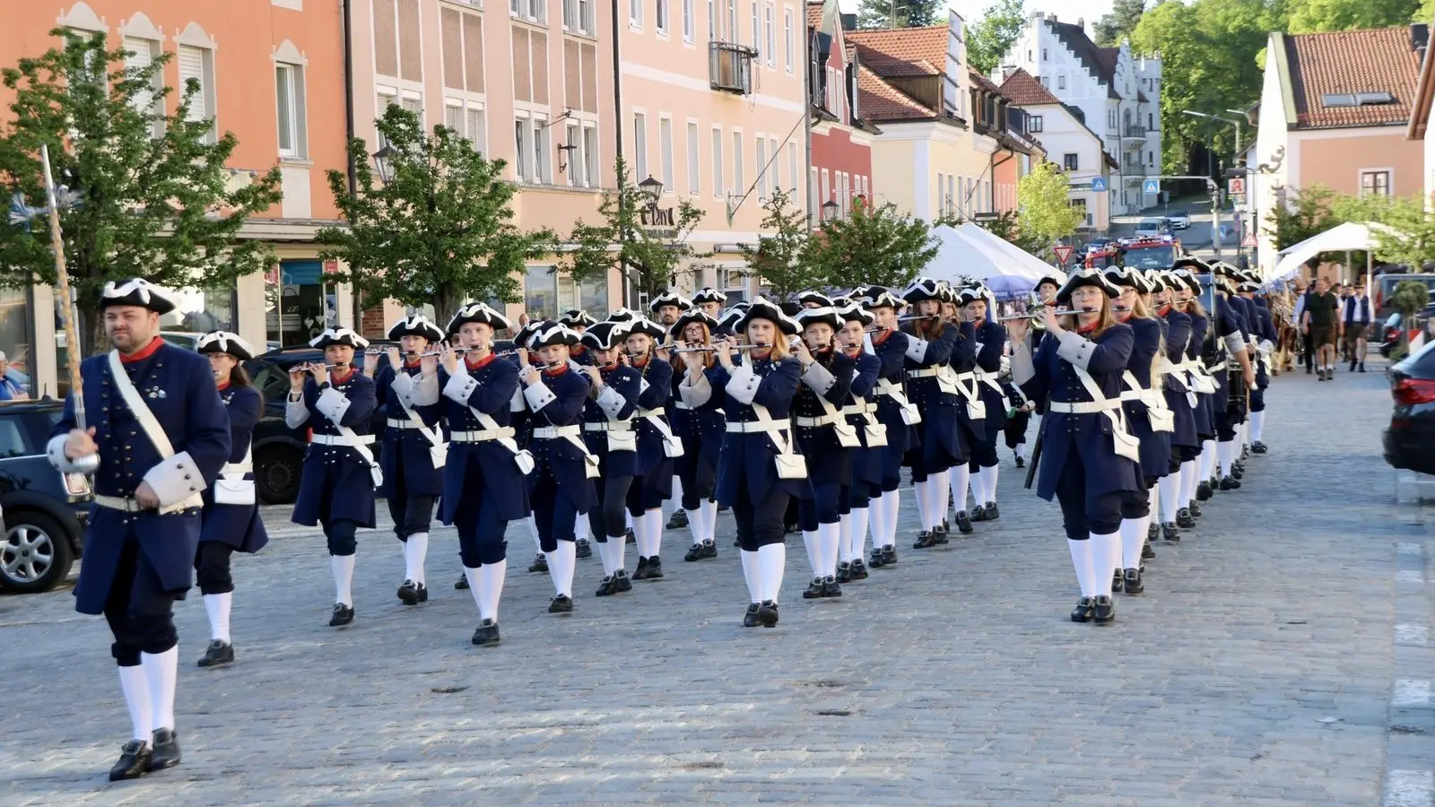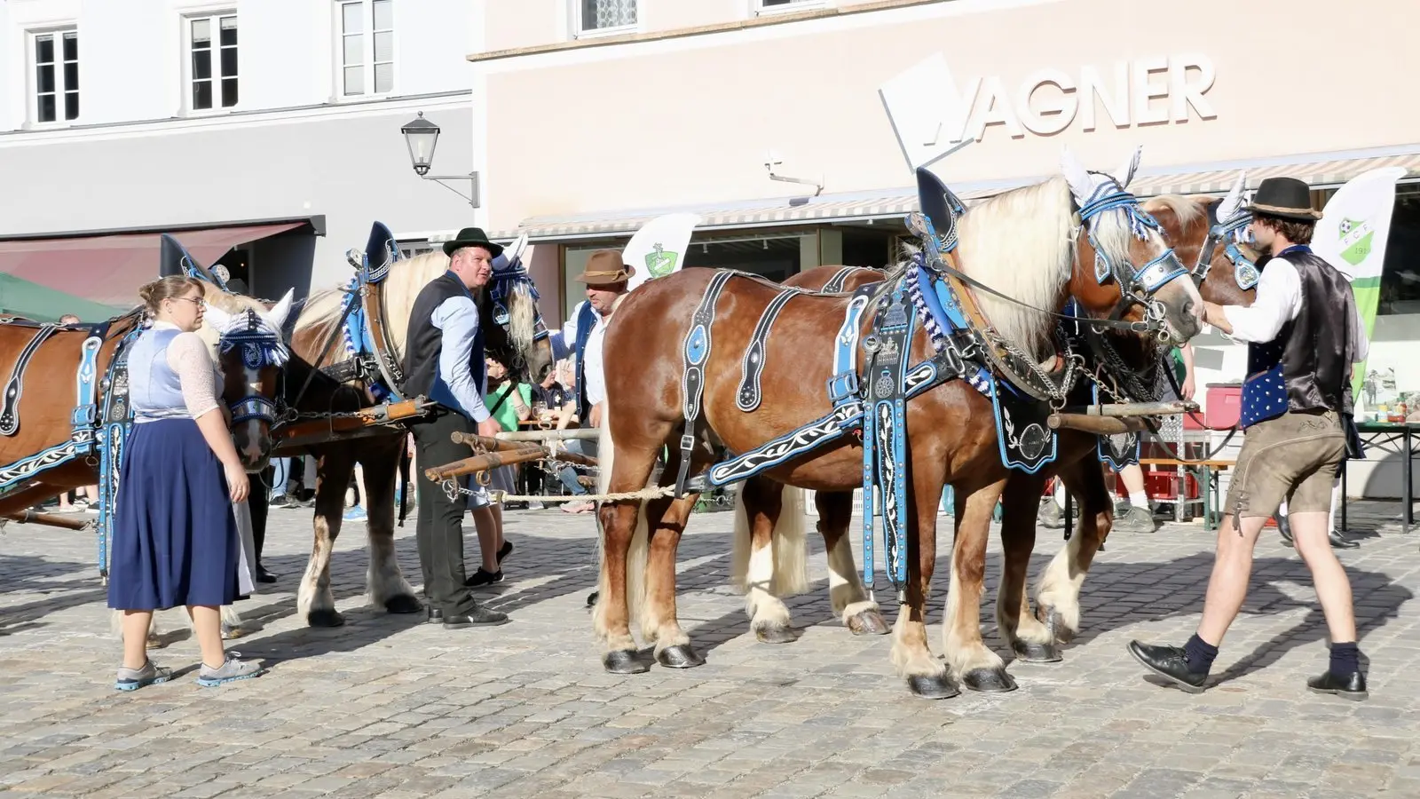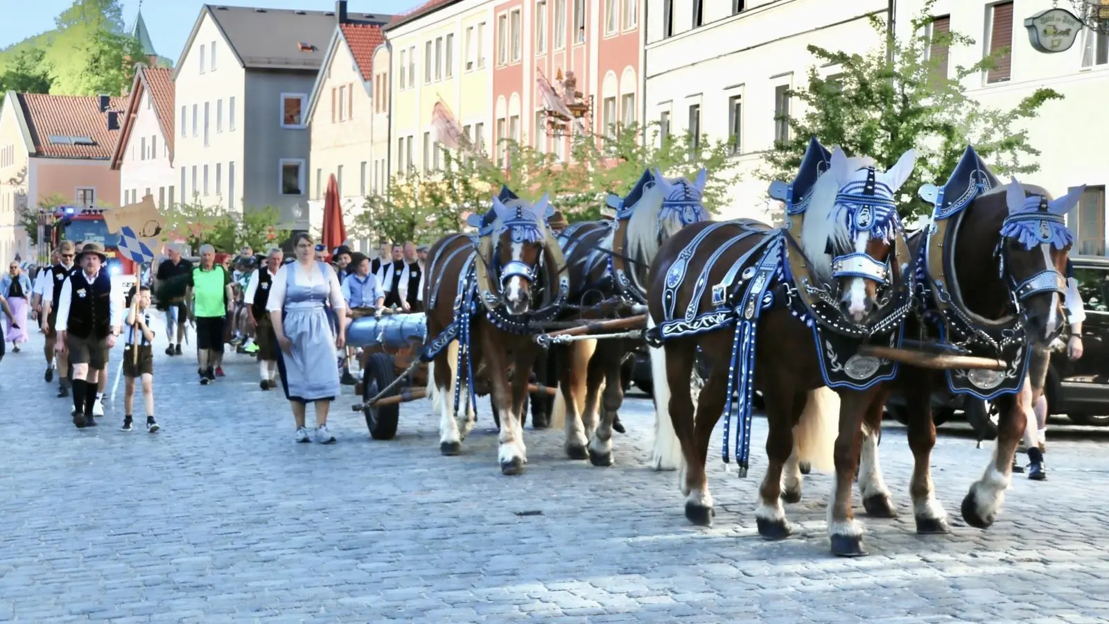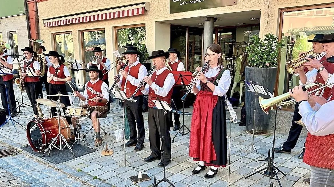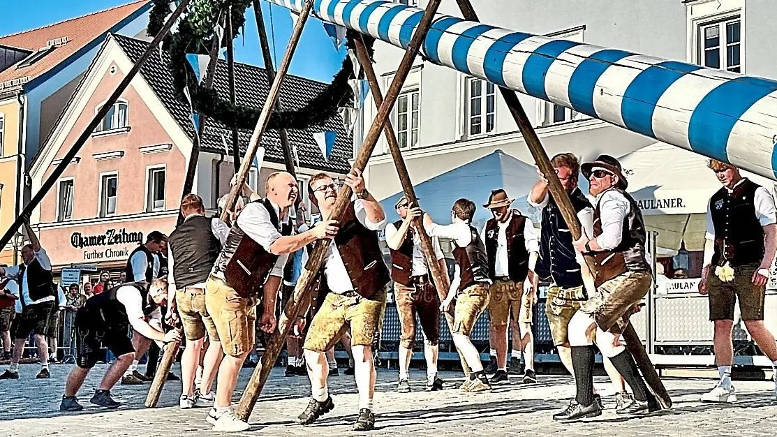 Das Spektakel nahm gegen 17.45 Uhr auf der Bahnhofstraße seinen Lauf. Dorthin hatten die Mitarbeiter des städtischen Bauhofes den Stamm gebracht. Angeführt vom Spielmannszug "Grenzfähnlein" zog ein Vierer-Gespann von Hans-Jürgen Traurig, der von Ritter Tobias Jelinek unterstützt wurde, den geschmückten Maibaum auf den Stadtplatz. In Furths "guter Stube" wurde er bereits von einigen Bürgern, die das "ViP"-Team und der FC Furth im Wald verköstigten, erwartet. Anschließend machten sich Mitglieder der "Ratsherrn", des FC Furth im Wald und des Bauhofes daran, den 27-Meter-Stamm in die Senkrechte zu wuchten. Die "Hau ruck!"-Anweisungen dazu gab Bauhof-Chef Christoph Haimerl. Musikalisch begleitet wurde dieser Kraftakt vom Blasorchester Furth im Wald. Um exakt 18.51 Uhr war es dann soweit: Der Maibaum 2025 stand. Anschließend wurden mittels der Feuerwehr-Drehleiter die Zunftzeichen der Stadt an den Stamm geschraubt. Der Maibaum bleibt bis zum Aufbau der Drachenstich-Bühne im Juli.