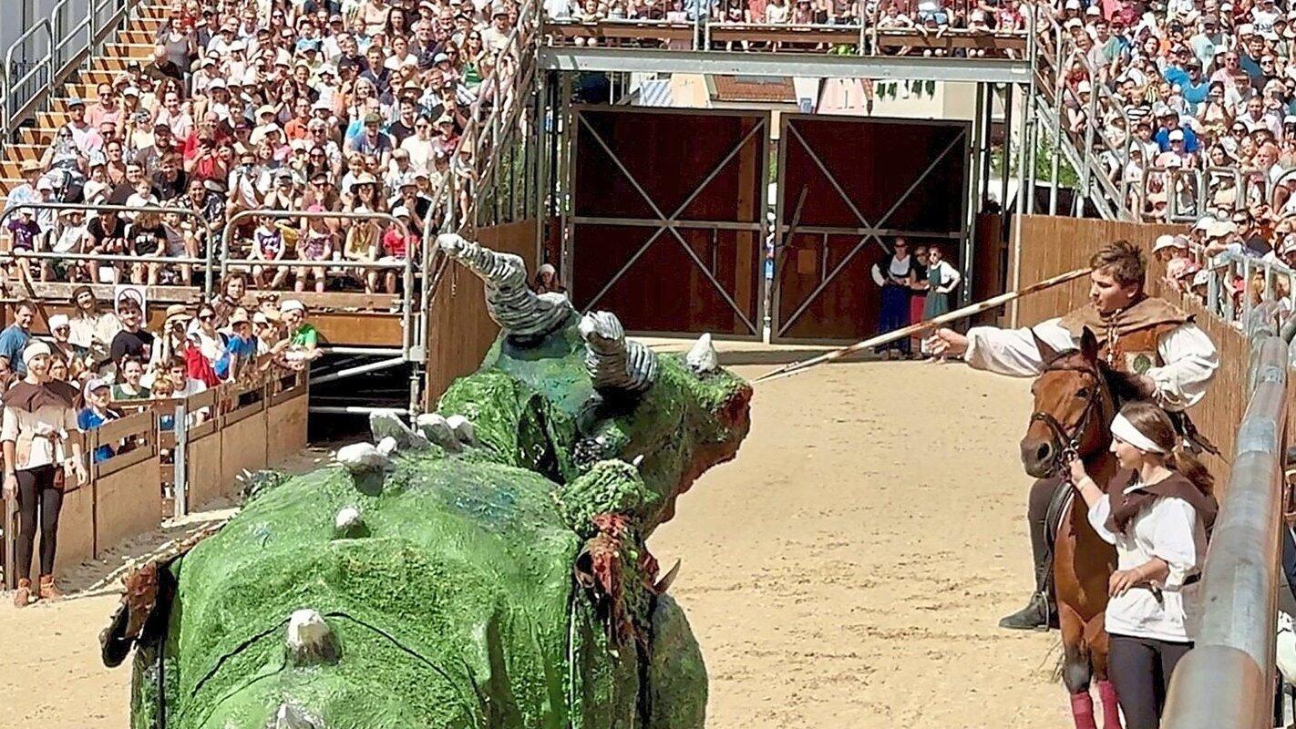 Auch bei den Kindern der Höhepunkt des Stücks: Ritter Christian Baumann beim Lanzenwurf in Eddis Maul.
