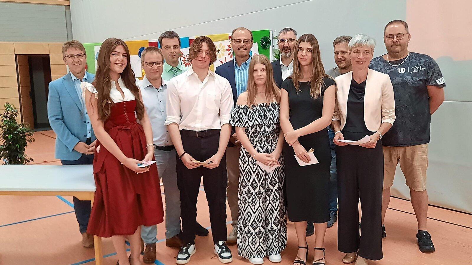 Die leistungsbesten Schüler mit den Ehrengästen: Arnschwangs Bürgermeister Michael Multerer, Lena Ohlschmid, Stephan Gröbner, Weidings Bürgermeister Daniel Paul, Jonas Kolbeck, Furths zweite Bürgermeister Michael Mühlbauer, Miriam Haberl, Konrektor Thomas Meindl, Lea Michetschläger, Anton Adam, Rektorin Barbara Aumann und Kazim Müller.