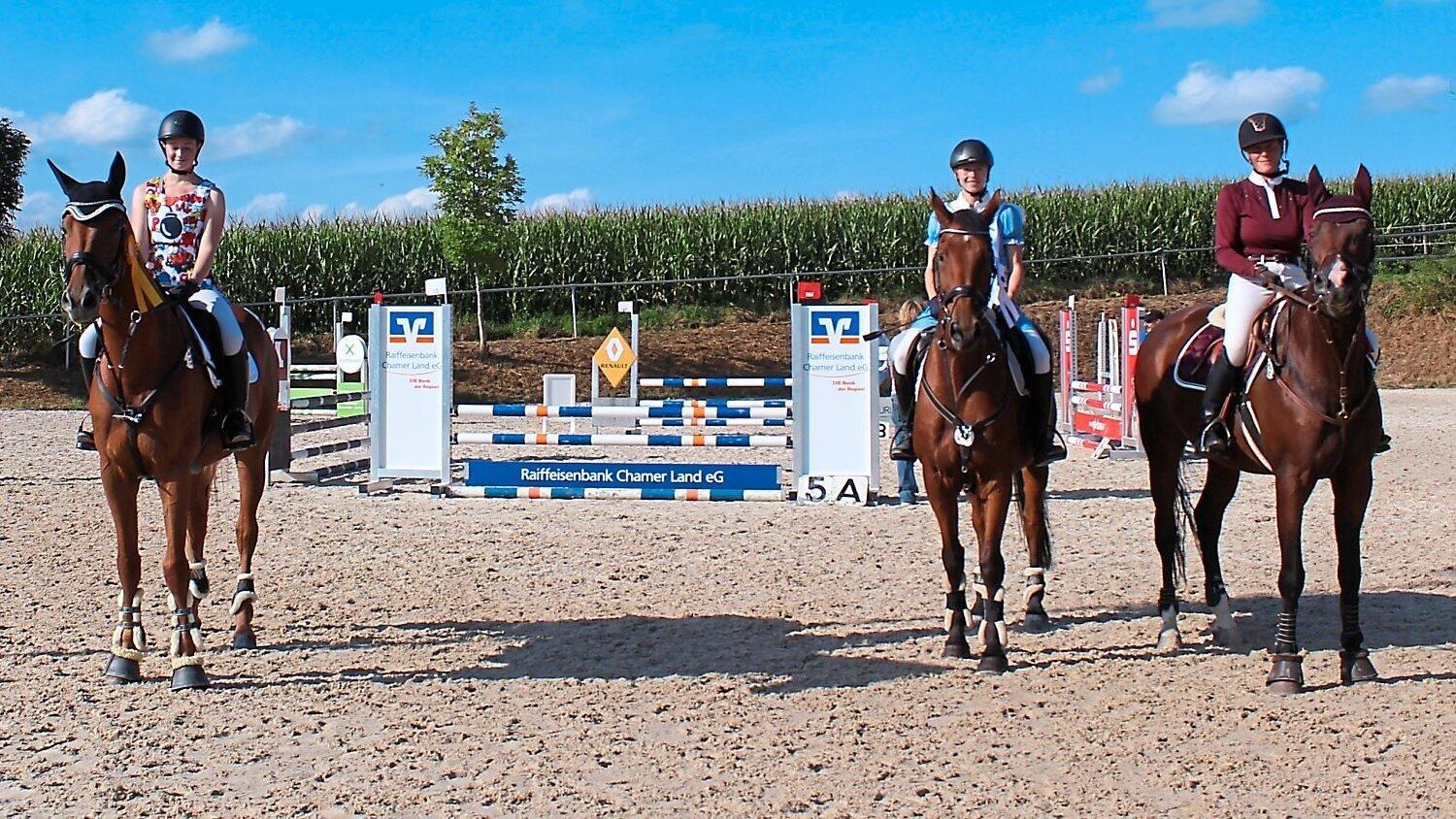 Die drei erstplatzierten Reiterinnen mit ihren Pferden der Springprüfung Klasse A mit Kostüm.