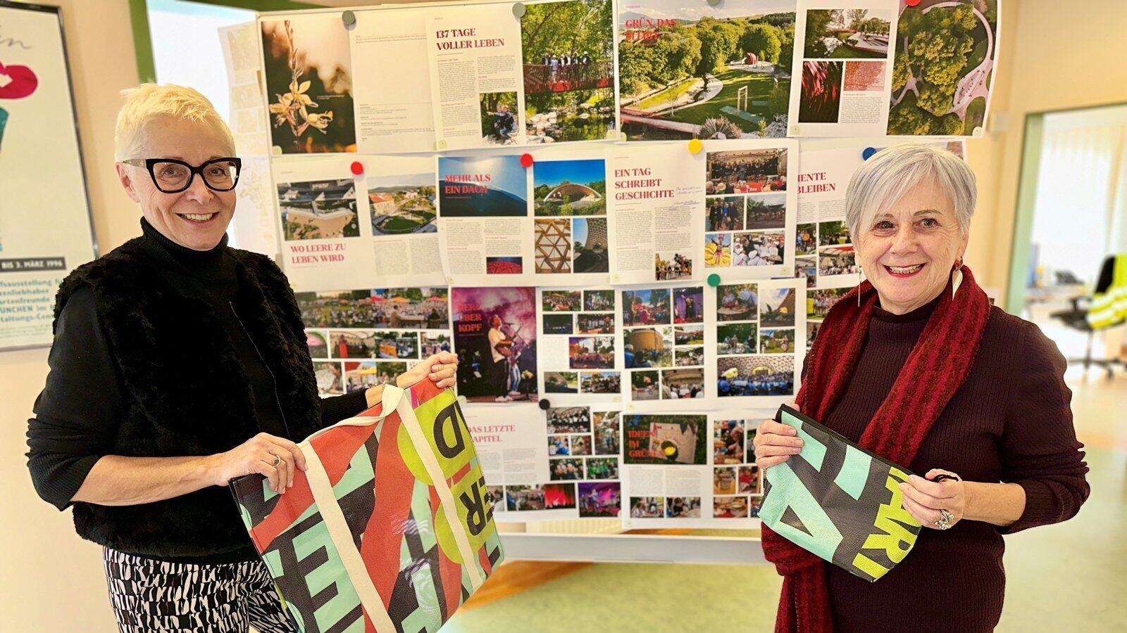 Ein passendes Weihnachtsgeschenk? Claudia Knoll (links) und Heidi Wolf präsentieren die Landesgartenschau-Taschen vor dem Layout des Further LGS-Buches. Beides wird es ab dem 29. November geben.