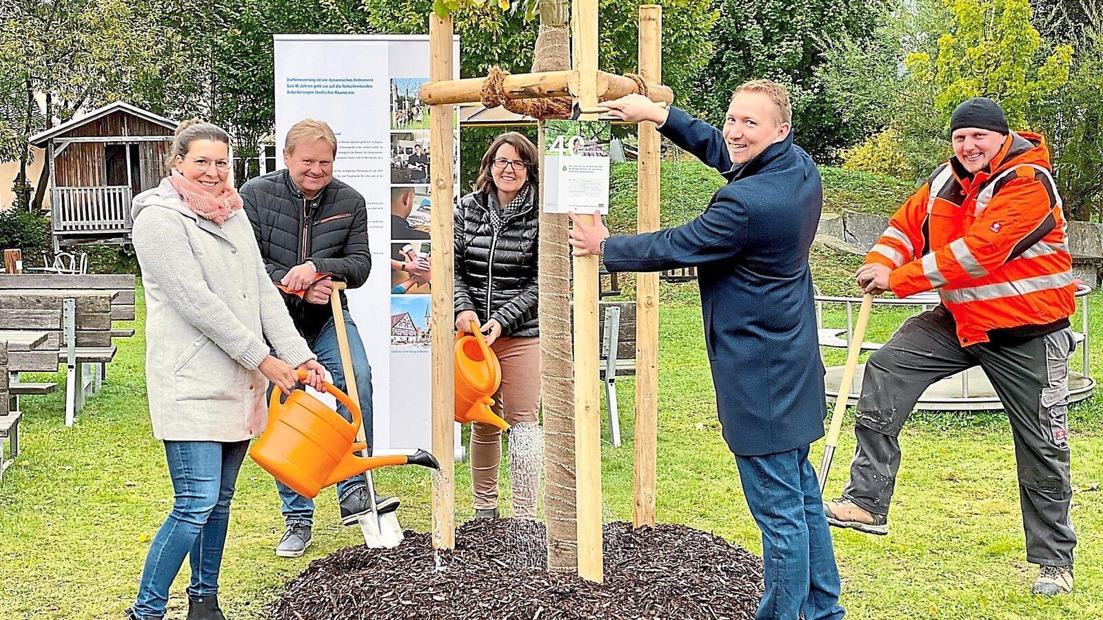 Ein junger Baum als Sinnbild einer erfolgreichen Dorferneuerung: Christina Seidel, Bürgermeister Wolfgang Daschner, Bianka Fechter, Michael Neft und Josef Mühlbauer (von links).