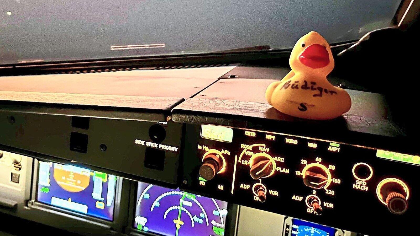 Das war wohl Rüdigers beste Aussicht: Dieter Wegner gelang es, den Enterich über den Wolken im Cockpit eines Airbus zu platzieren.