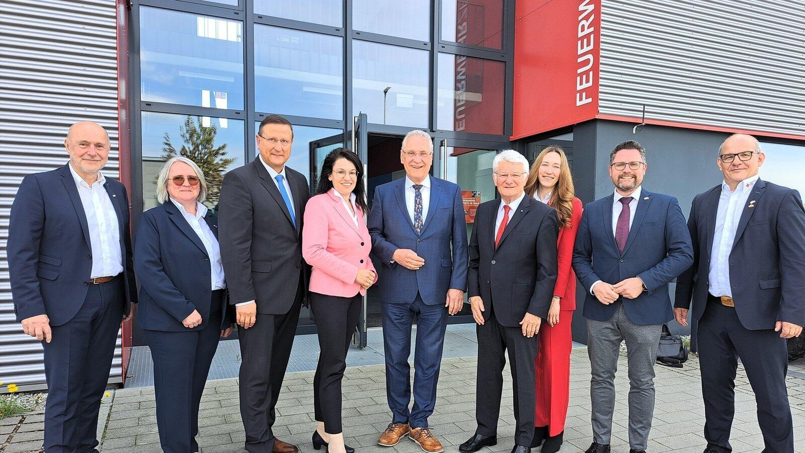 Joachim Herrmann (links) wurde am Mittwoch von BRK-Kreisvorsitzendem Theo Zellner am Rettungszentrum in Furth im Wald empfangen. Am dortigen Arbeitsgespräch nahmen außerdem Bundestagsabgeordnete Martina Englhardt-Kopf, Landtagsabgeordneter Gerhard Hopp, BRK-Kreisgeschäftsführer Manfred Aschenbrenner, stellvertretender Landrat Markus Müller sowie GüRD-Projektleiter Manfred Maurer, dessen Stellvertreterin Tereza Homolková und Assistentin Martina Thiel teil.